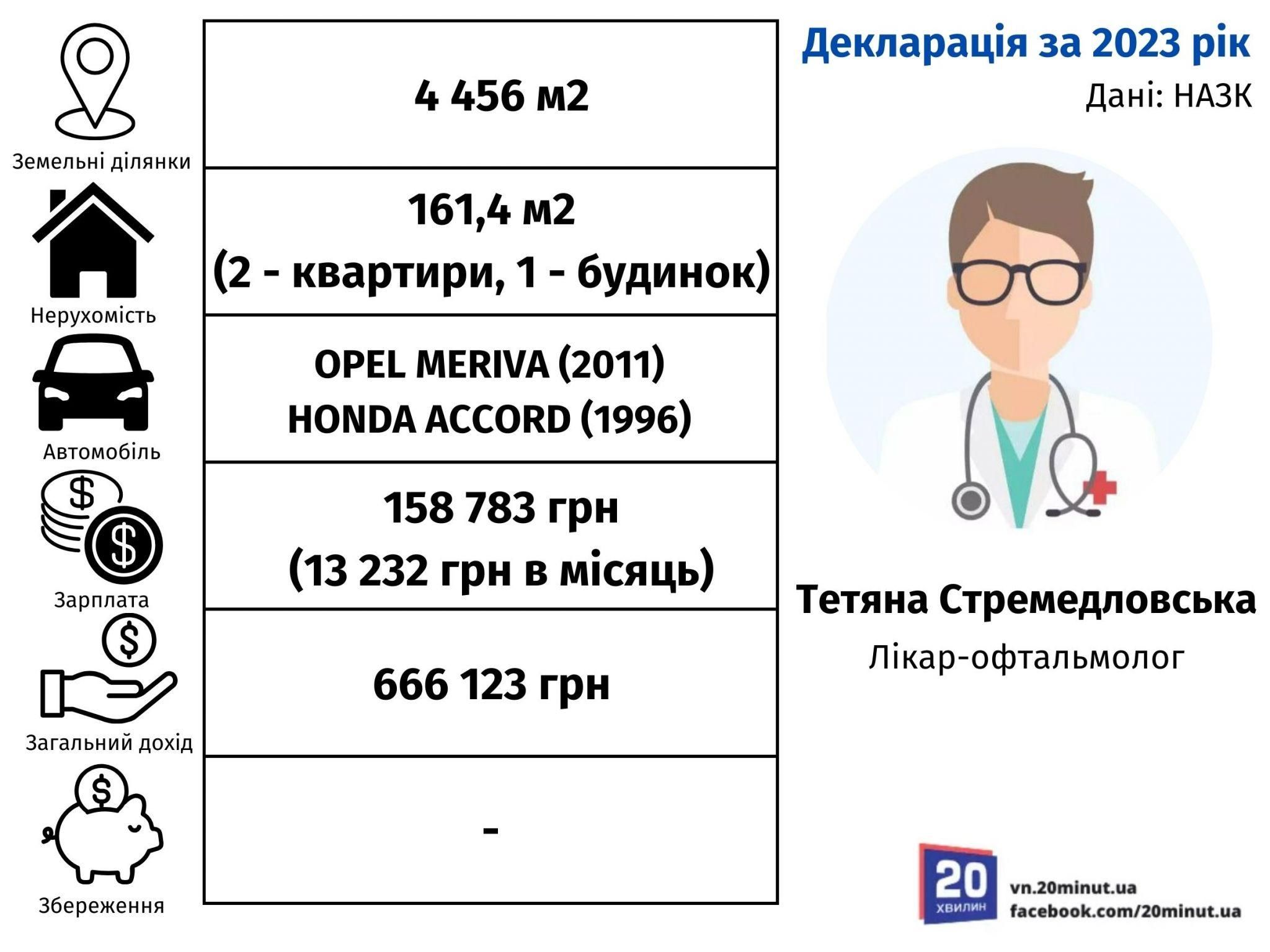 Лікар-офтальмолог Тетяна Стремедловська володіє 4 456 м² землі, двома квартирами, одним будинком та одним нежитловим приміщенням. Загальна площа нерухомості становить 161,4 м².