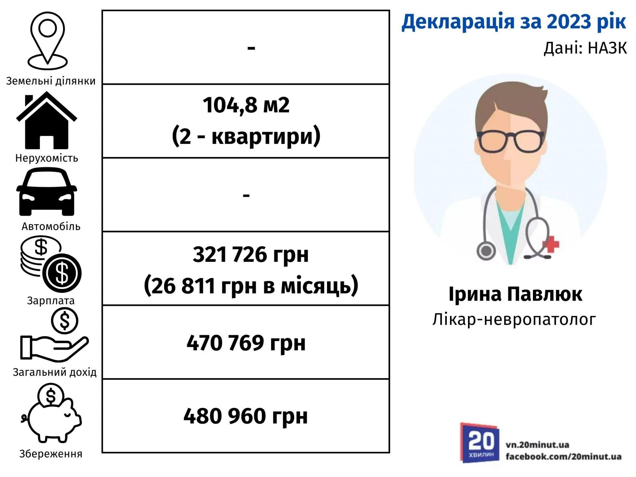 Лікарем-невропатологом є Ірина Павлюк. У неї немає землі, але є дві квартири, загальною площею 104,8 м². Автомобіля у жінки також немає.
