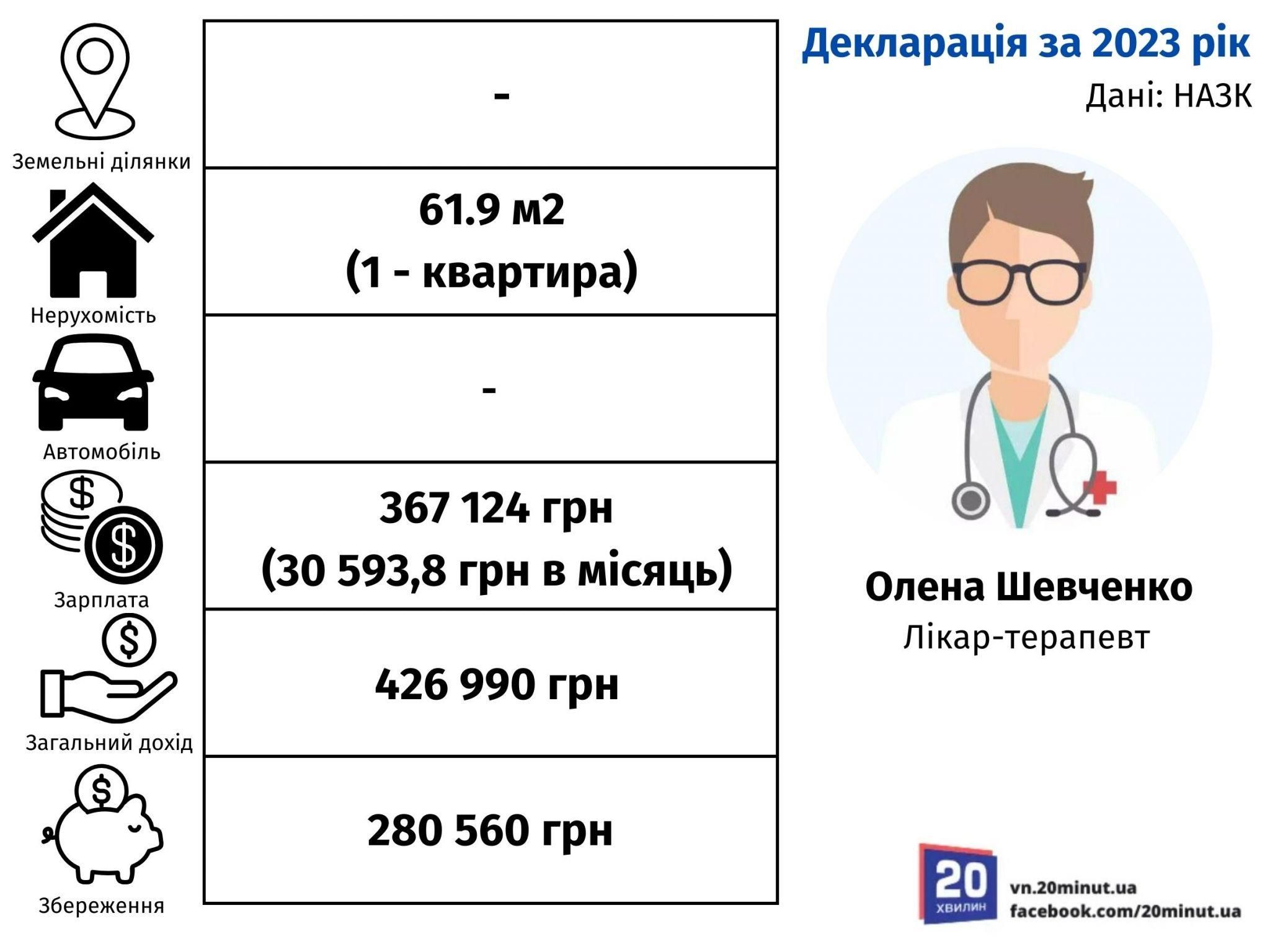 Ще одним лікарем-терапевтом є Олена Шевченко. Землі у неї немає, є лише квартира площею 61,9 м². Транспортних засобів у неї також немає. Зарплата за 2023 рік вийшла 367 124 грн, в середньому по 30 593,67 грн. З пенсією загальний дохід лікарки склав 426 990 грн. Заощаджень у жінки є на суму 280 560 грн.