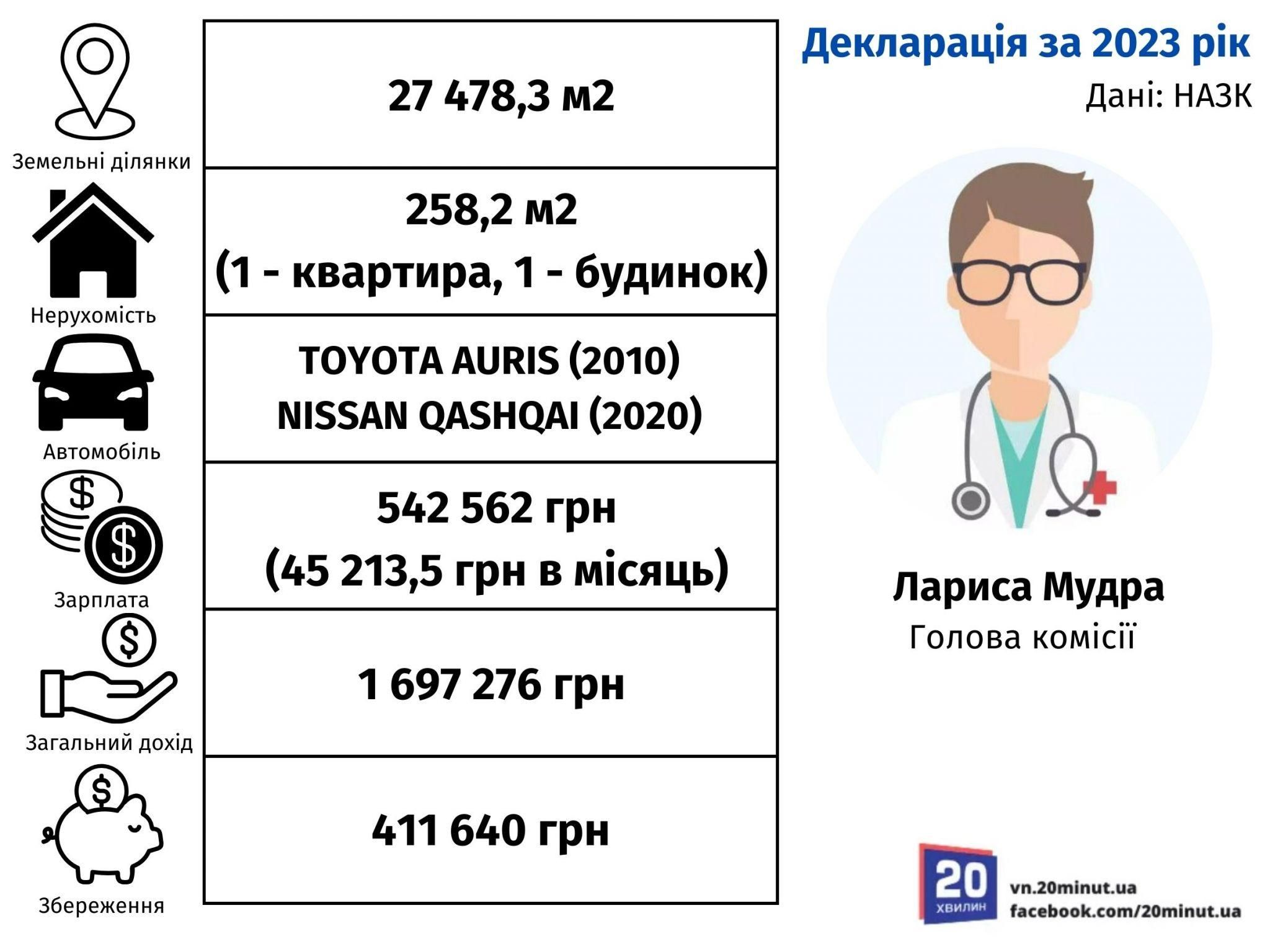 Зарплата голови комісії за 2023 рік склала 542 562 грн, приблизно 45 213,5 грн на місяць. Загальний дохід разом з чоловіком вийшов 1 697 276 грн. Ця сума переважно складається з зарплати Лариси та Олександра. Так, на посаді керівника медичного реабілітаційного центру «Південний Буг» МВС України чоловік за 2023 рік заробив 950 589 грн (79 215,75 грн на місяць). Крім того, отримав пенсію розміром 197 224 грн. Збережень у родини є на суму 411 640 грн.