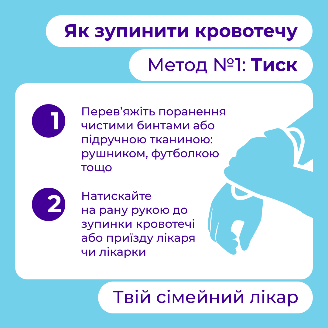 Існує кілька методів, як зупинити кровотечу. Як пояснюють спеціалісти проєкту, будь-яка кровотеча зупиняється методом тиску:
