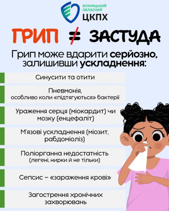 У Вінницькому обласному центрі контролю та профілактики хвороб повідомляють, що епідемічний поріг наразі не перевищений, проте грип і COVID-19 можуть призвести до серйозних ускладнень. Лікарі нагадують, що вірус здатний викликати пневмонію, запалення серцевого м’яза чи мозку, проблеми з м’язами та навіть поліорганну недостатність, а також загострення хронічних хвороб.