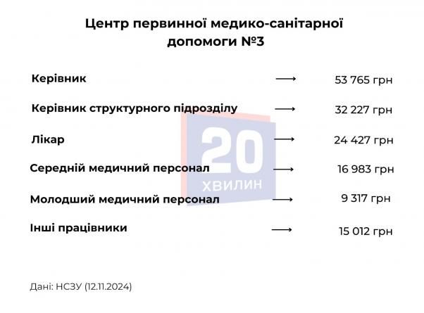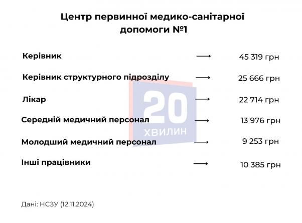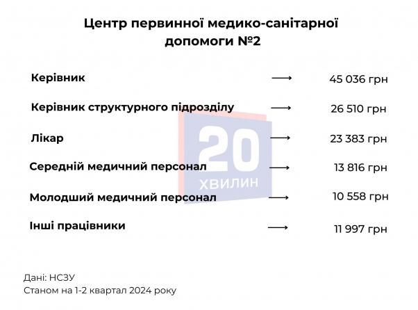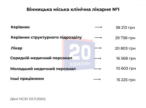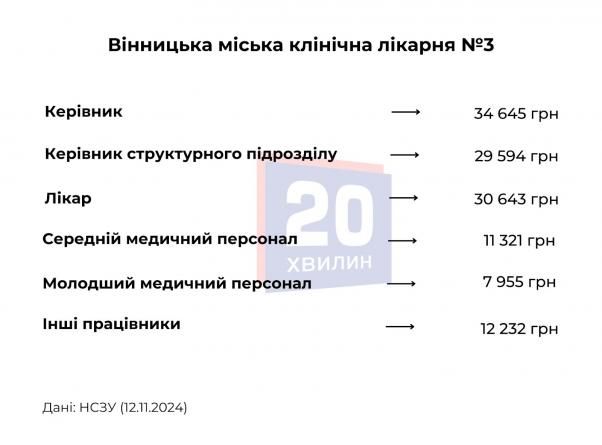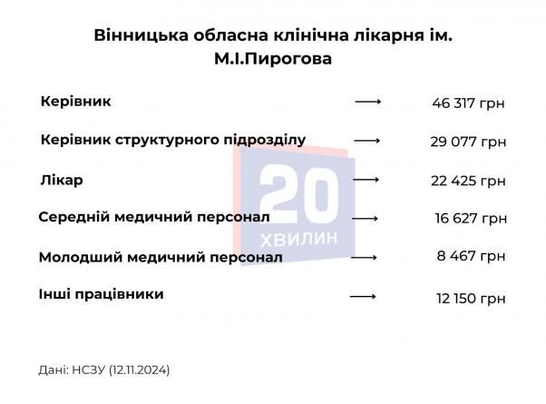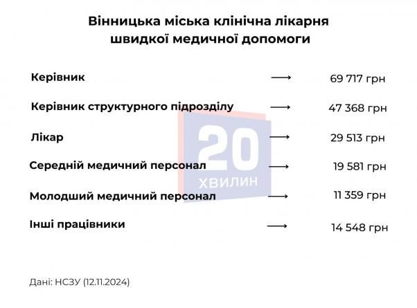 Згідно з підрахунками, середньомісячна зарплата медичного працівника за перший та другий квартал 2024 року у Вінниці становила 17 938 грн. У керівника медичного центру чи лікарні вона в середньому склала 46 903 грн. Керівники структурних підрозділів мали майже вдвічі меншу середньомісячну зарплату — 29 882 грн. Зарплата лікарів становила 24 660 грн, а середнього медичного персоналу — 17 797 грн на місяць. Молодший медичний персонал отримував 9 956 грн, а інші працівники медзакладів — у середньому 15 365 грн на місяць.