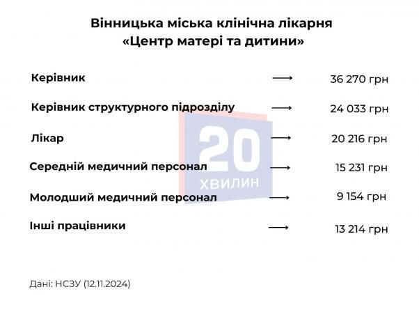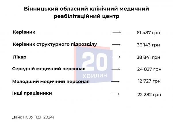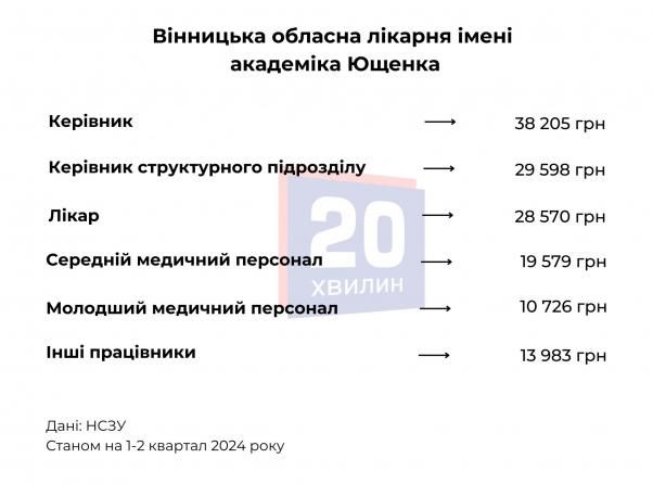 Найвища зарплата була у лікарів Вінницького обласного клінічного медичного реабілітаційного центру, середня сума якої становила 38 841 грн на місяць. Найменше — 20 216 грн — отримували лікарі у Вінницькій міській клінічній лікарні «Центр матері та дитини».