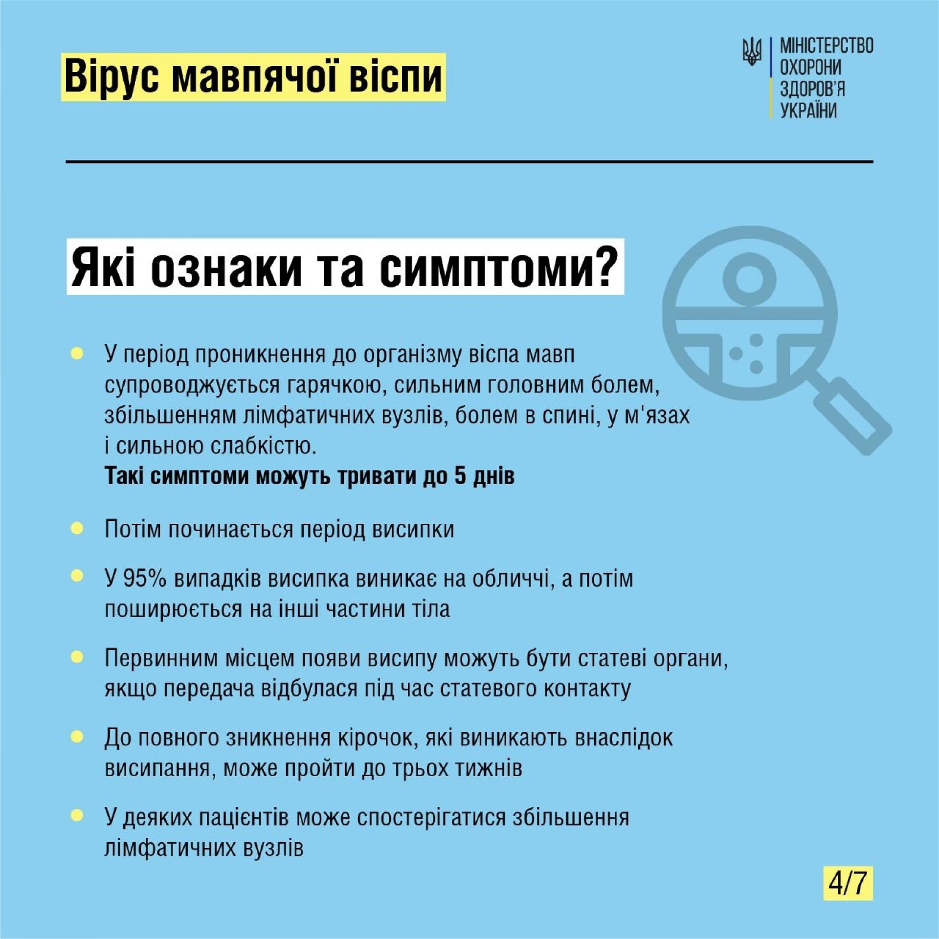 МОЗ оприлюднило інфографіку, де зібрало всю відому інформацію — відповіді на найпоширеніші запитання стосовно цього захворювання: як передається хвороба, які ознаки та симптоми має, а також яка профілактика і діагностування віспи мавп.