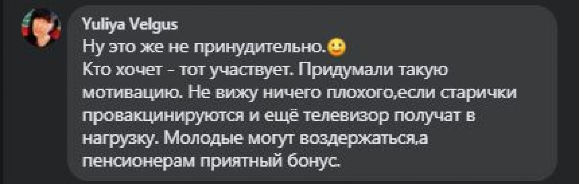 «Ну это же не принудительно. Кто хочет — тот участвует. Придумали такую мотивацию. Не вижу ничего плохого, если старички провакцинируются и еще телевизор получат в нагрузку», — читаємо коментар російською мовою.