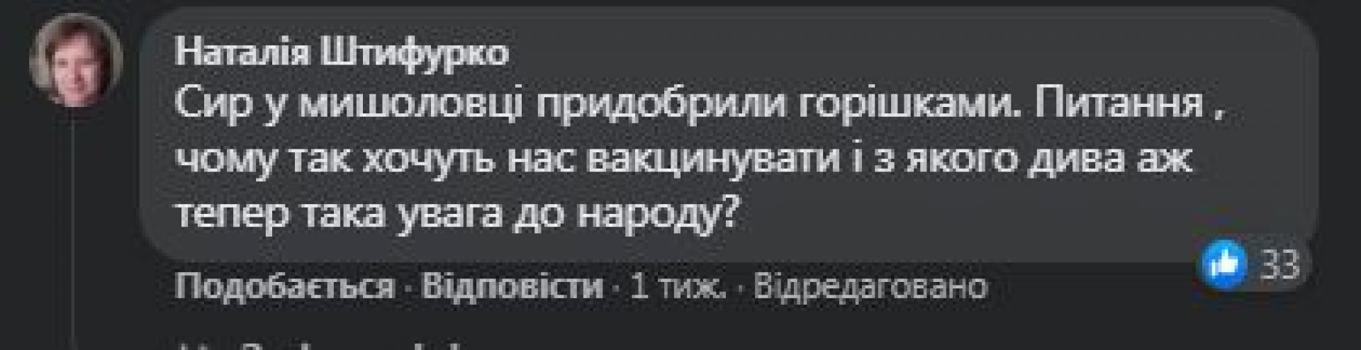 «Сир у мишоловці придобрили горішками. Питання, чому так хочуть нас вакцинувати і з якого дива а ж тепер така увага до народу», — пише вона.