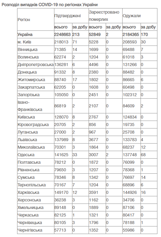 За даними Центру громадського здоров’я за добу 25 липня в Україні зафіксовано 213 нових підтверджених випадків коронавірусної хвороби COVID-19 (з них дітей – 11, медпрацівників – 0).