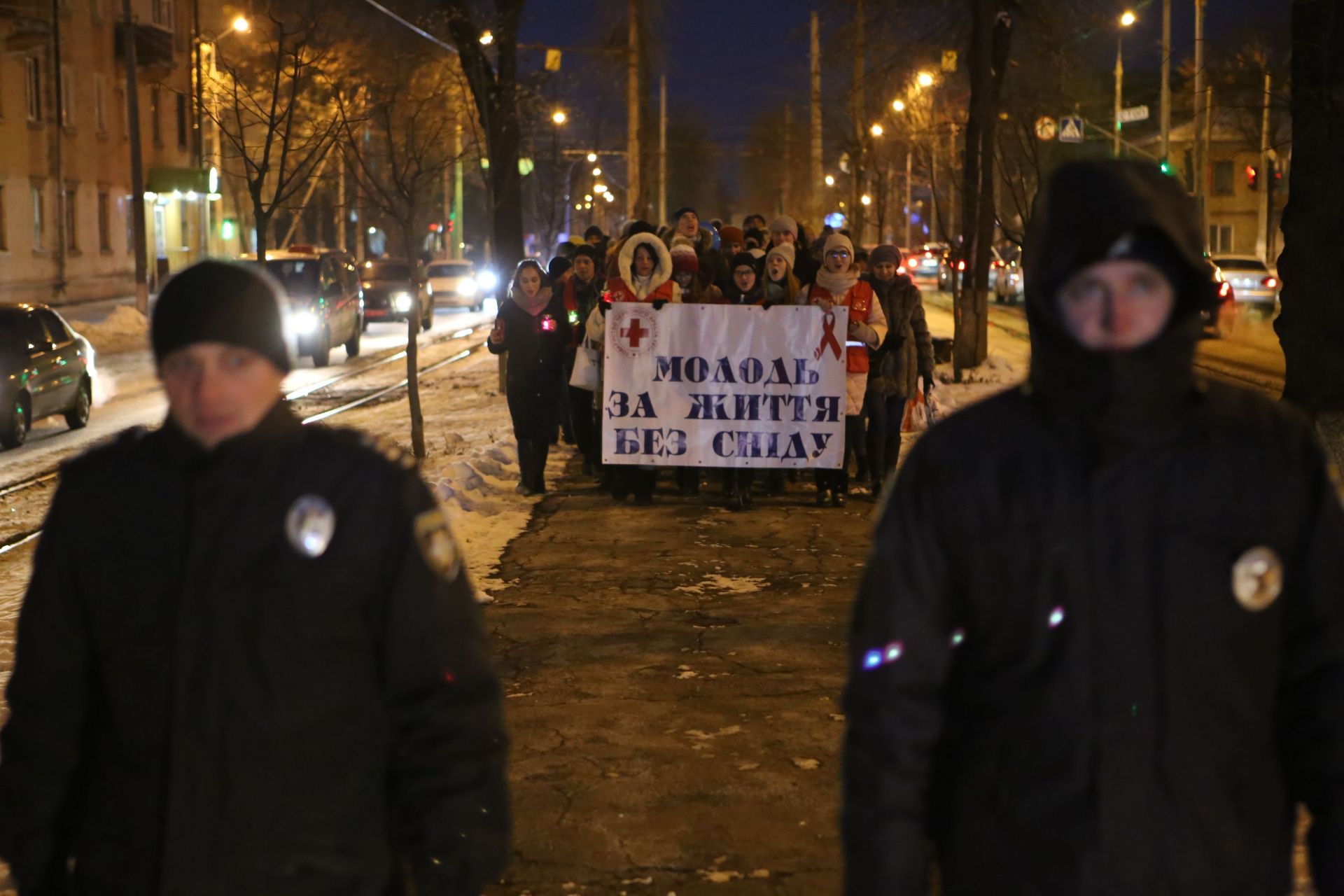 Вінницькі студенти пройшлись свічковою ходою від “Зорі” до Будинку Офіцерів. Молодь несла свічки та плакат “Молодь Вінниці за життя без СНІДу”. У такий спосіб студенти згадали померлих від СНІДу вінничан.