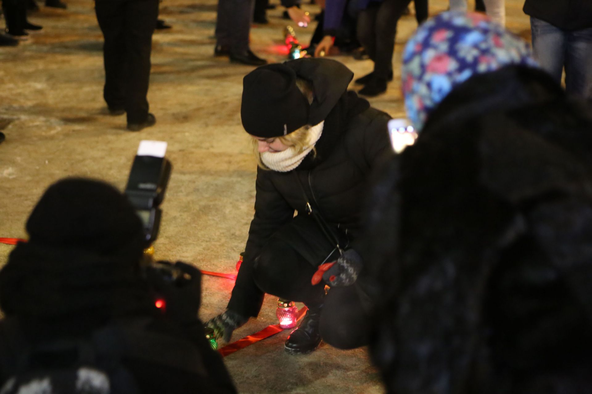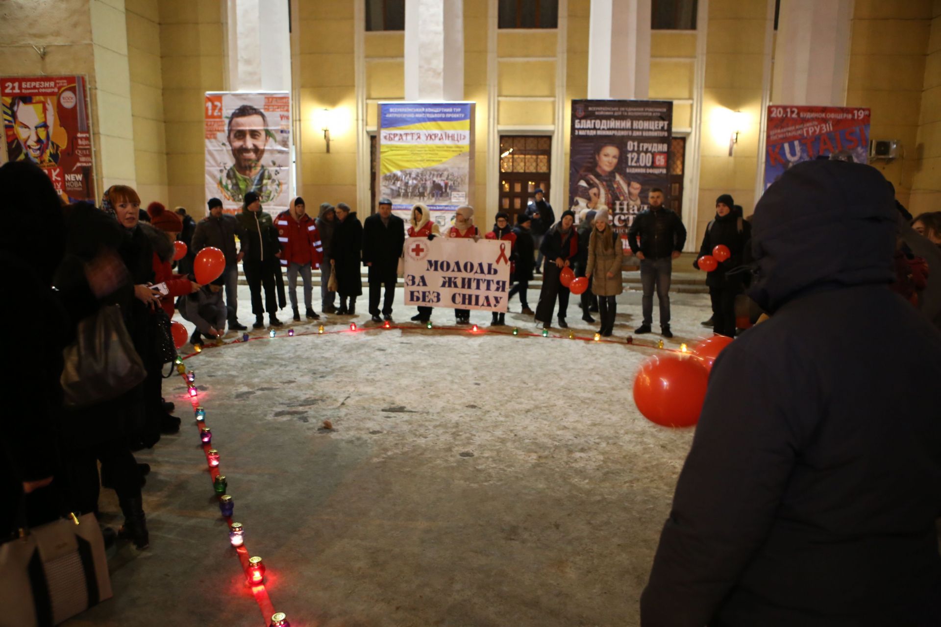 На площі перед Будинком офіцерів молодь виклала зі свічок стрічку - символ боротьби з ВІЛ/СНІДом.