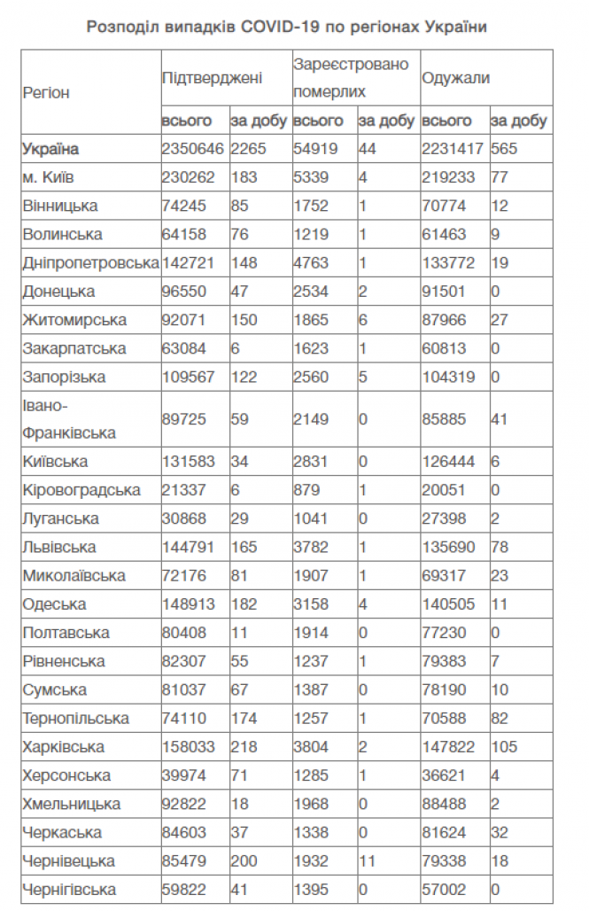 - Кількість інфікованих COVID-19 людей сягає понад 2,3 мільйона, одужали — 2,2 мільйона.