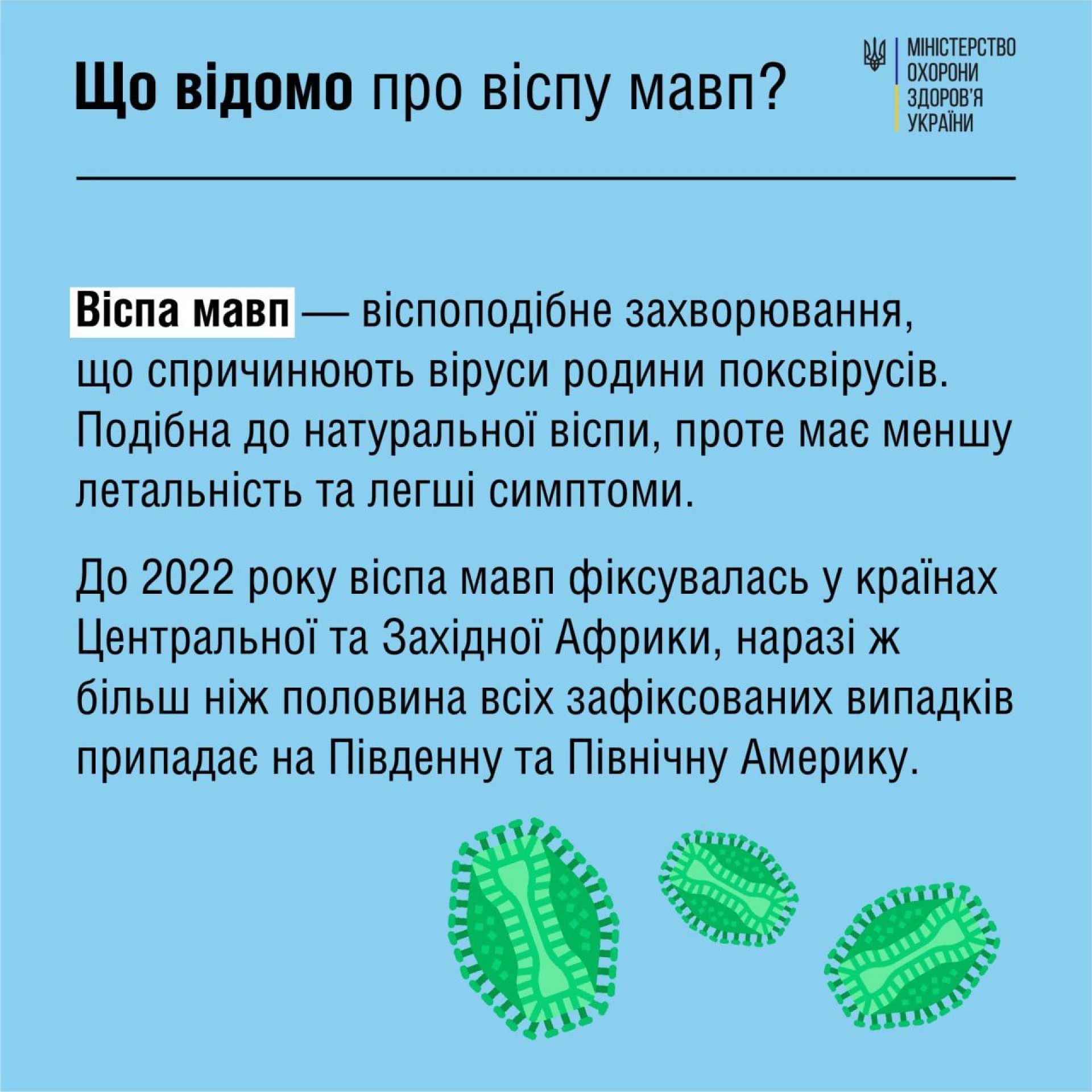 - До 2022 року віспа мавп фіксувалась у країнах Центральної та Західної Африки, наразі ж більше половини всіх зафіксованих випадків припадає на Південну та Північну Америку.