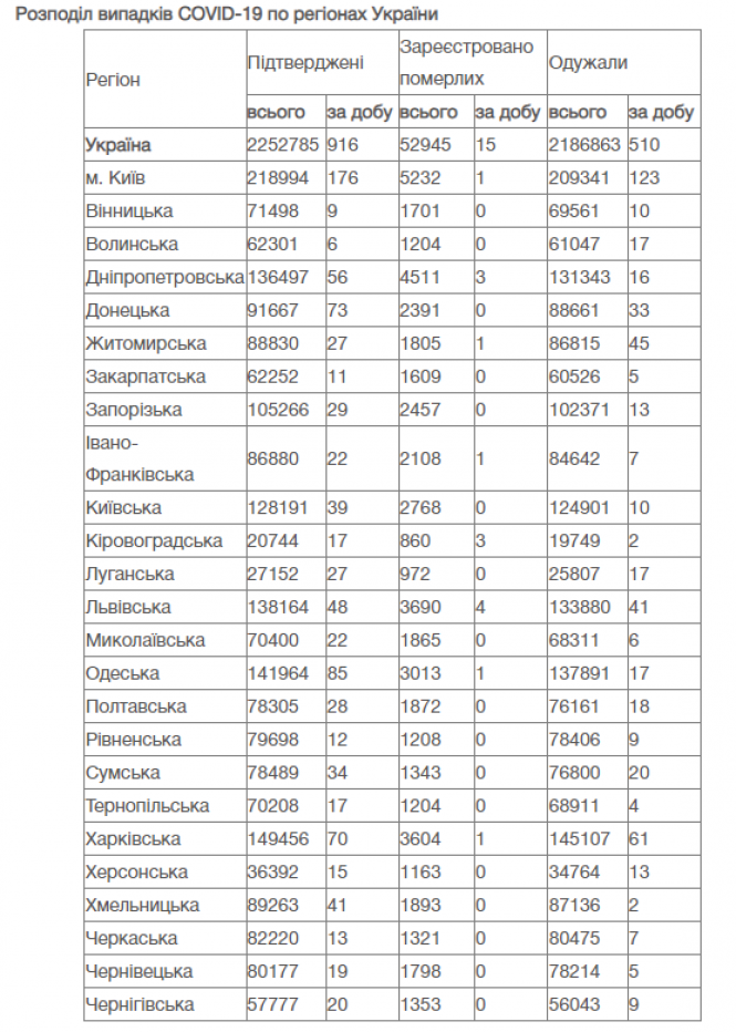 За даними Центру громадського здоров’я за добу 30 липня в Україні зафіксовано Україні зафіксовано 916 нових підтверджених випадків коронавірусної хвороби COVID-19 (з них дітей — 61, медпрацівників — 43).