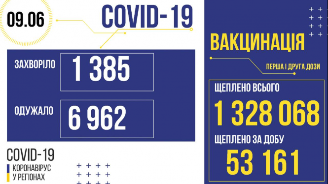 Станом на 9 червня в Україні зафіксували 1 385 нових випадків коронавірусної хвороби COVID-19.
