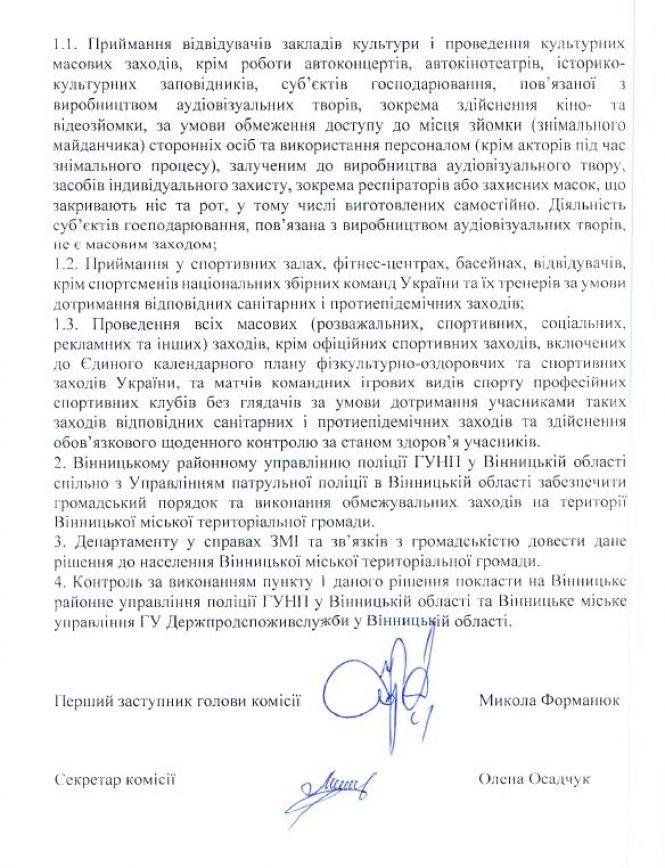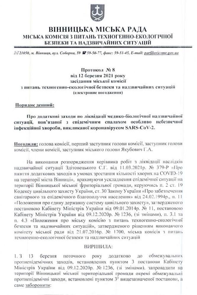 «Через стрімке поширення захворюваності на COVID-19 у Вінниці до протиепідемічних заходів «помаранчевого» рівня ... у Вінниці вводяться карантинні обмеження «червоного» рівня щодо заборони проведення будь-яких масових заходів та роботи спортивних закладів і закладів культури, — зазначається в документі. — І обмеження починають діяти з 13 березня».