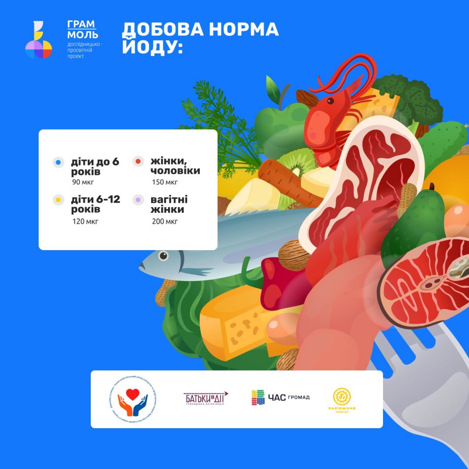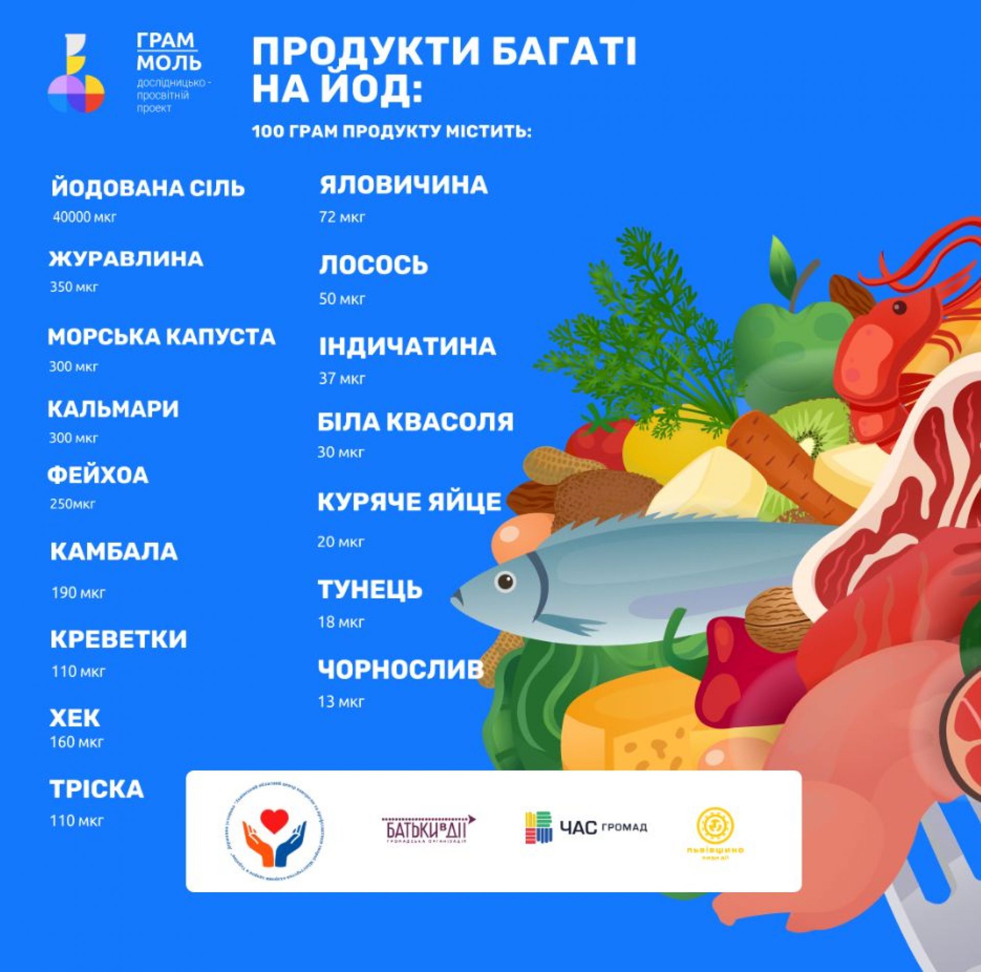 На 94 % йод ми отримуємо із продуктів рослинного і тваринного походження і лише 6 % — з питної води та повітря. Загалом за все життя споживаємо 3-5 г йоду — менше чайної ложки.