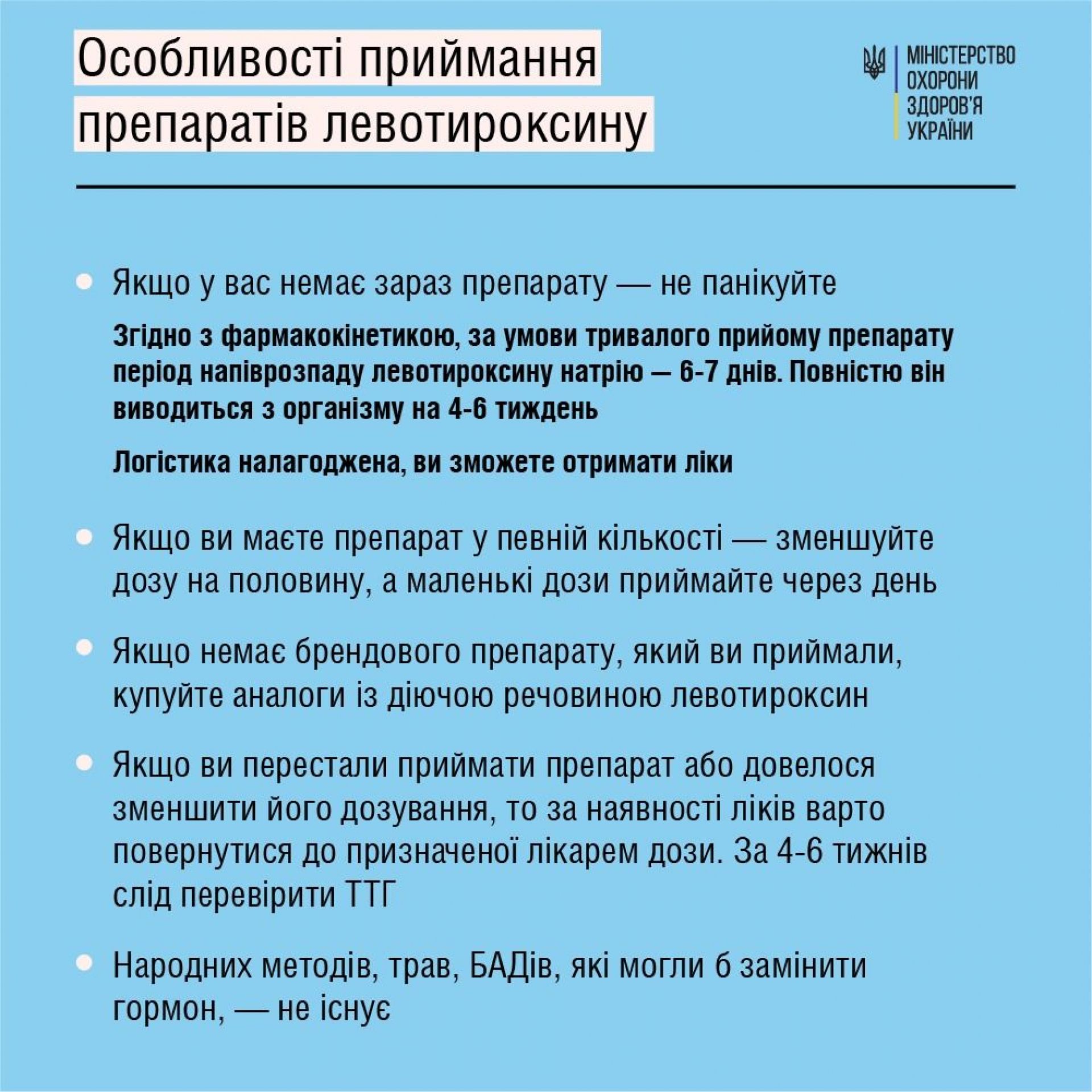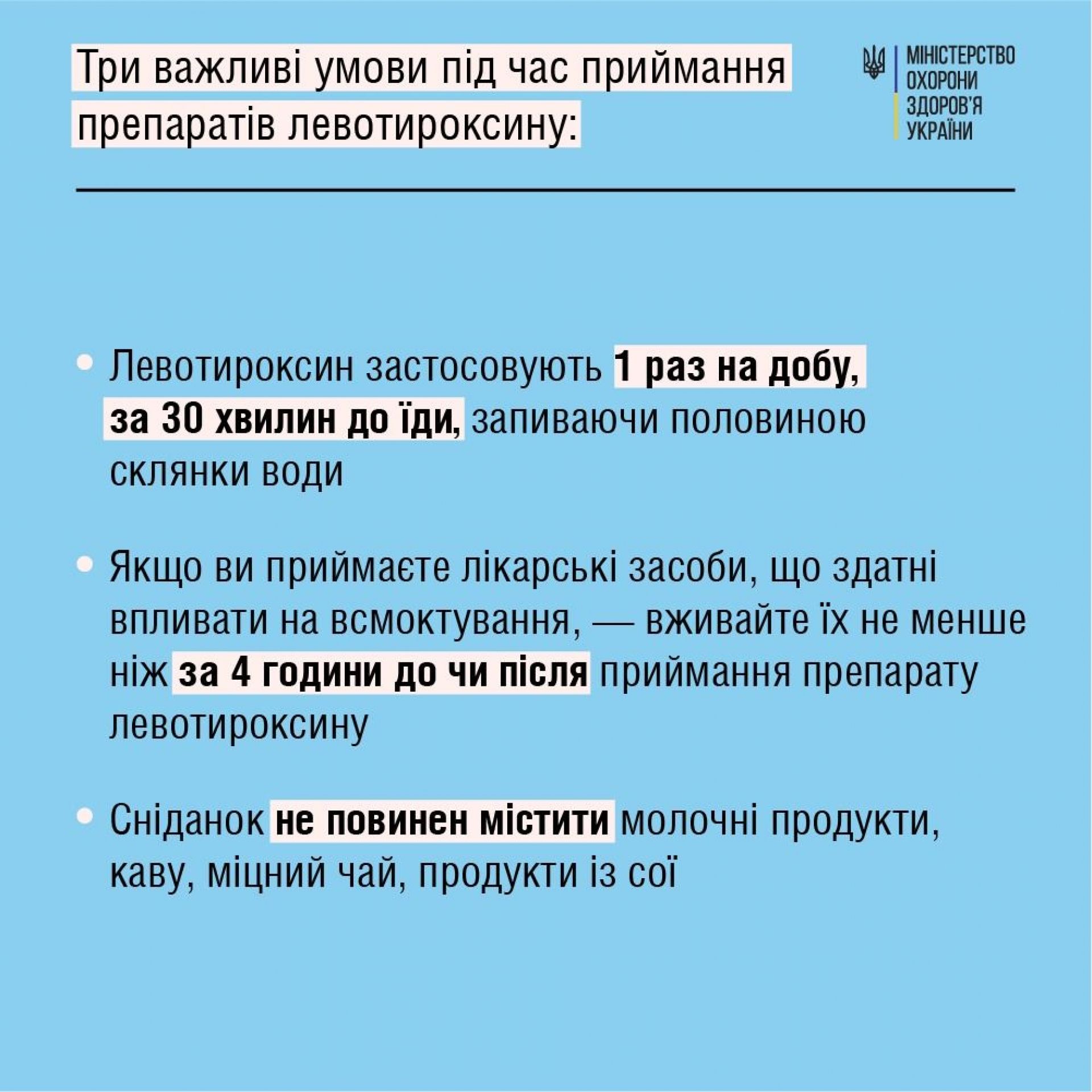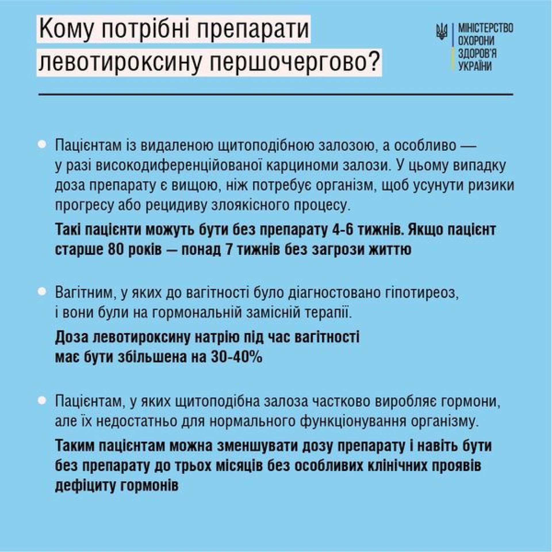 Необхідність терапії препаратами гормонів щитоподібної залози має близько 2% дорослих українців. Іншим такі ліки не потрібні. Якщо людина вживає препарати левотироксину без призначення лікаря, у неї розвиваються симптоми гіпертиреозу, тиреотоксикозу. Вони негативно впливають на серцево-судинну, нервову та інші органи і системи організму.