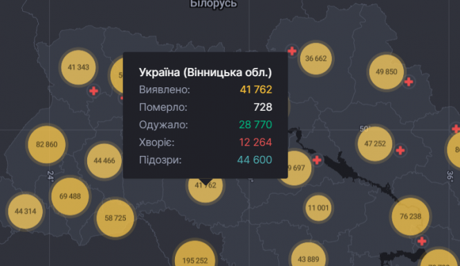 За останню добу найбільша кількість підтверджених випадків зареєстрована у Вінницькій (578), Житомирській (570), Івано-Франківській (508), Львівській (507) та Чернівецькій (447) областях.