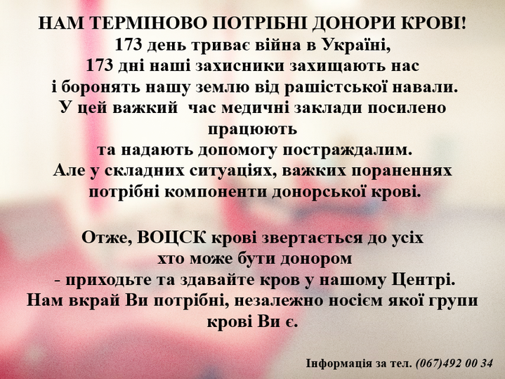 Вінницький обласний центр служби крові просить вінничан долучитись до здачі крові всіх груп. Про це вчоора, 15 серпня, повідомили на фейсбук-сторінці центру.