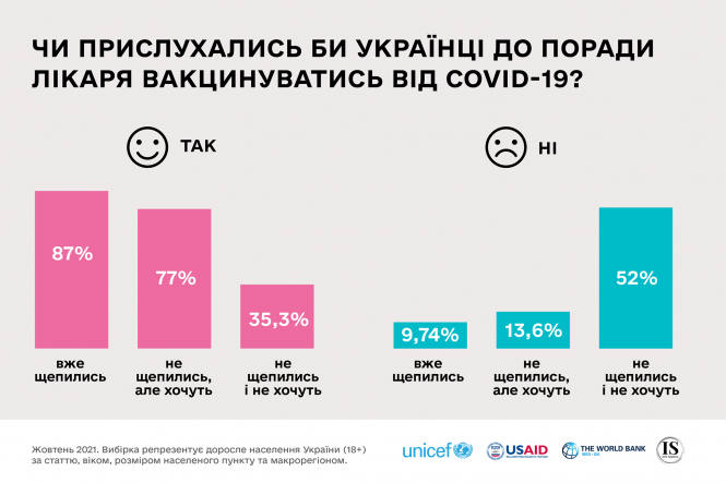 Важливою у процесі вакцинації є роль сімейного лікаря. 87% щеплених українців сказали, що прислухались до поради лікаря щодо вакцинації. З тих, хто ще не вакцинувались, 77% дослухались би до поради лікаря вакцинуватись.