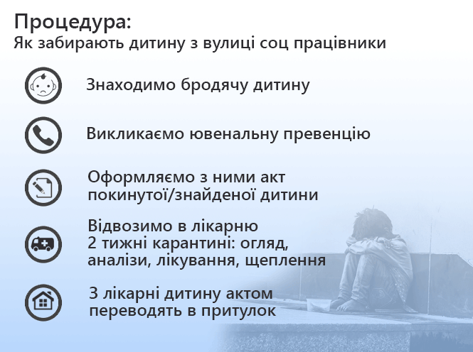 Правда, з дітьми проблем немає. Їх забирають з вулиці і прилаштовують в лікарню, потім притулок. А служба у справах дітей, вже згодом замовляє свідоцтво про народження. Якщо дитина не знає, як її звати, включається процес пошуку спочатку рідних/знайомих, а якщо дитина знає, як її звати, просто замовляється свідоцтво.