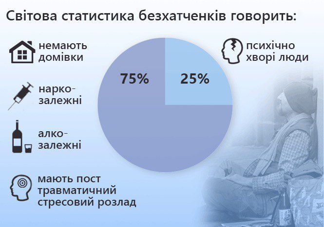 За словами психіатра Ольги Чайки, серед безхатченків десь четверта частина — це люди з важкими психічними патологіями. Якщо говорити про жінок, то в минулому в них був якийсь абьюз, їх або вигнали з роботи, або покинув чоловік, або сталася ще якась трагедія, і жінка згодом опинилась на вулиці.