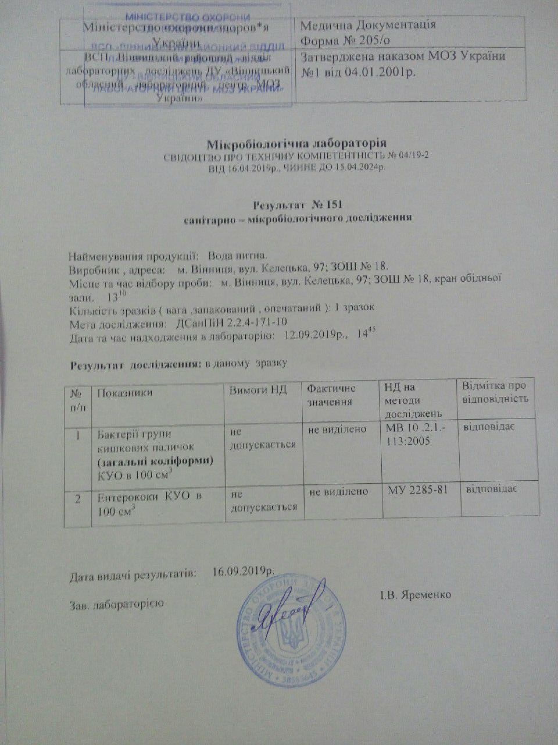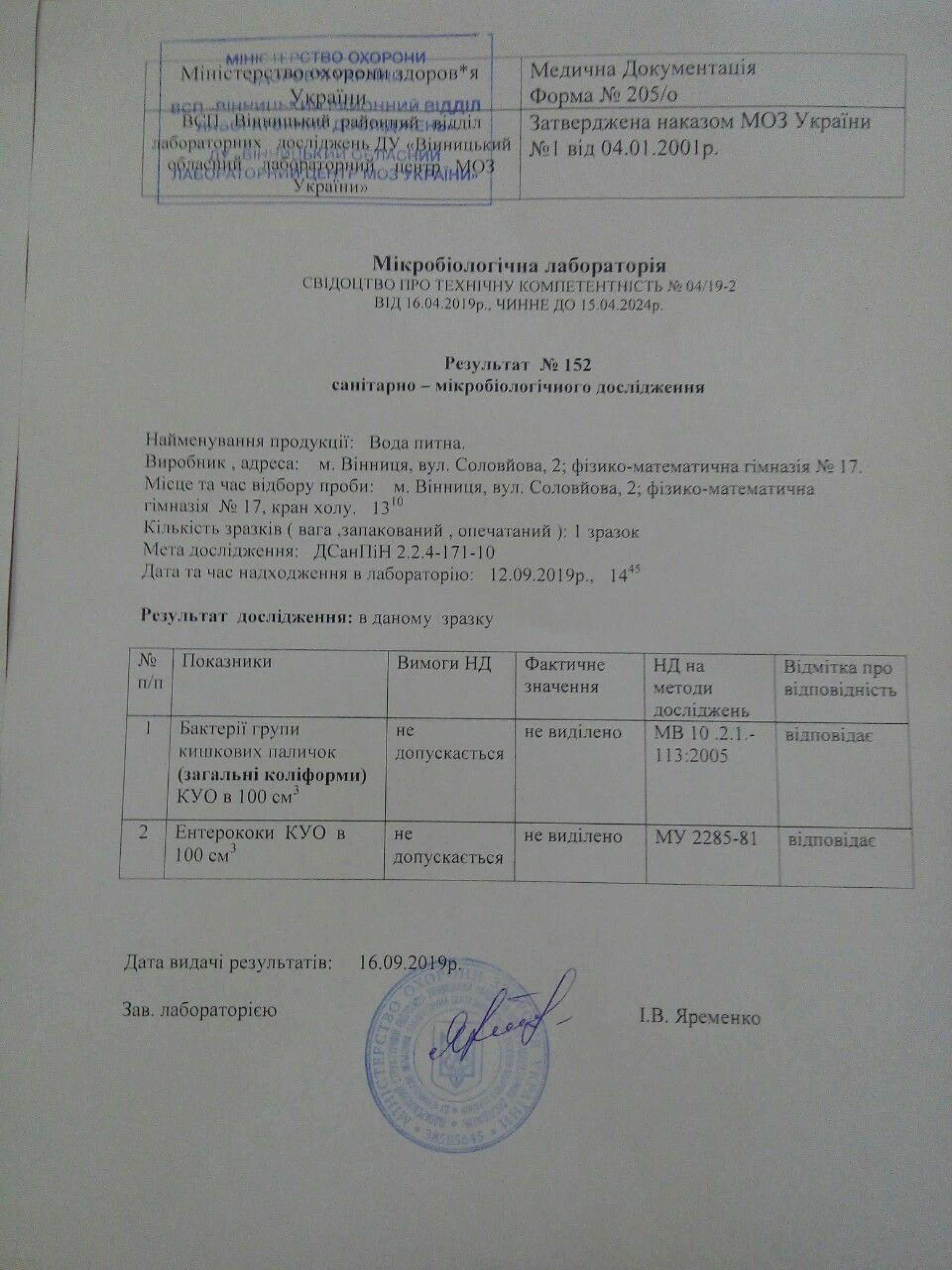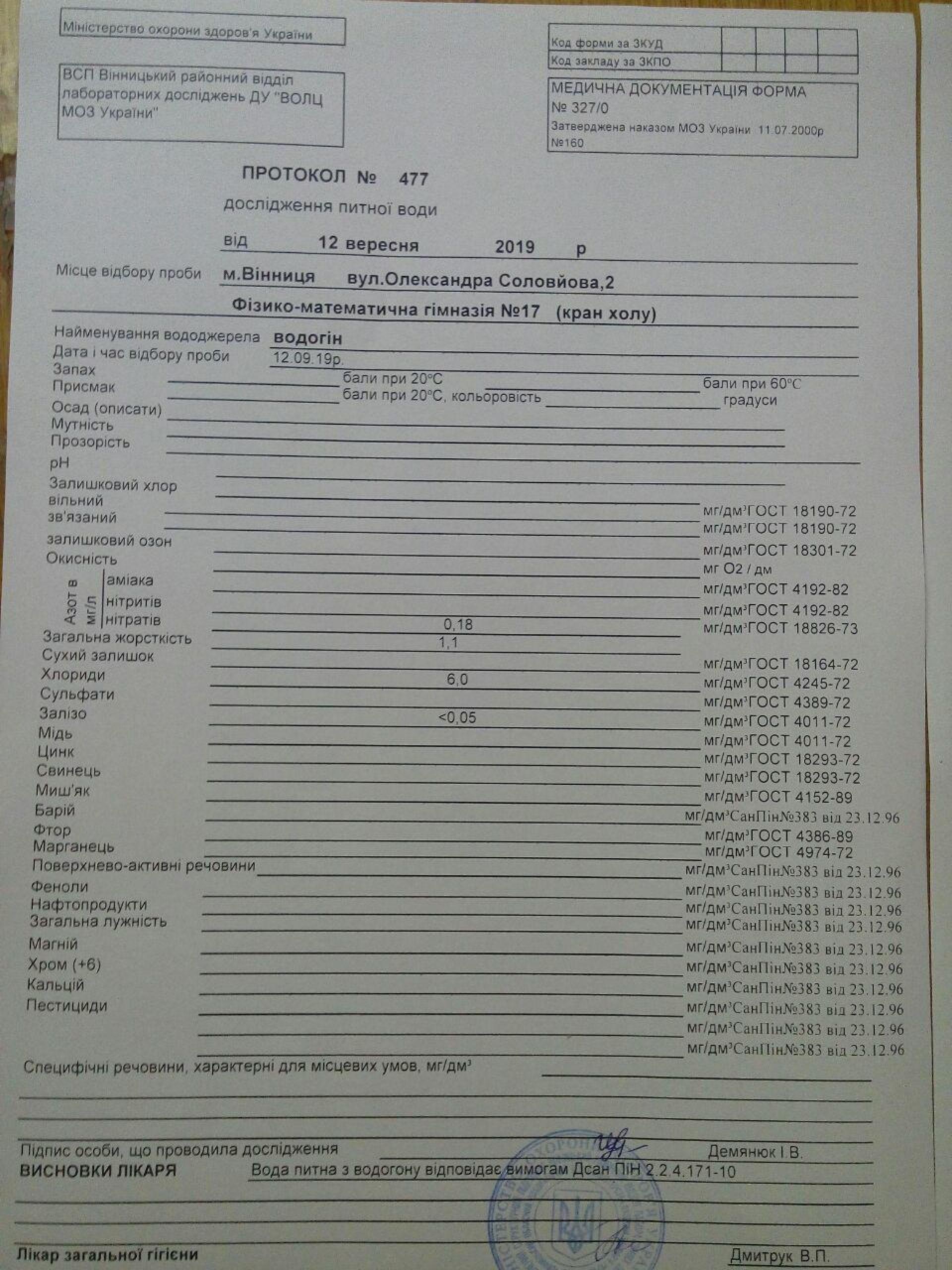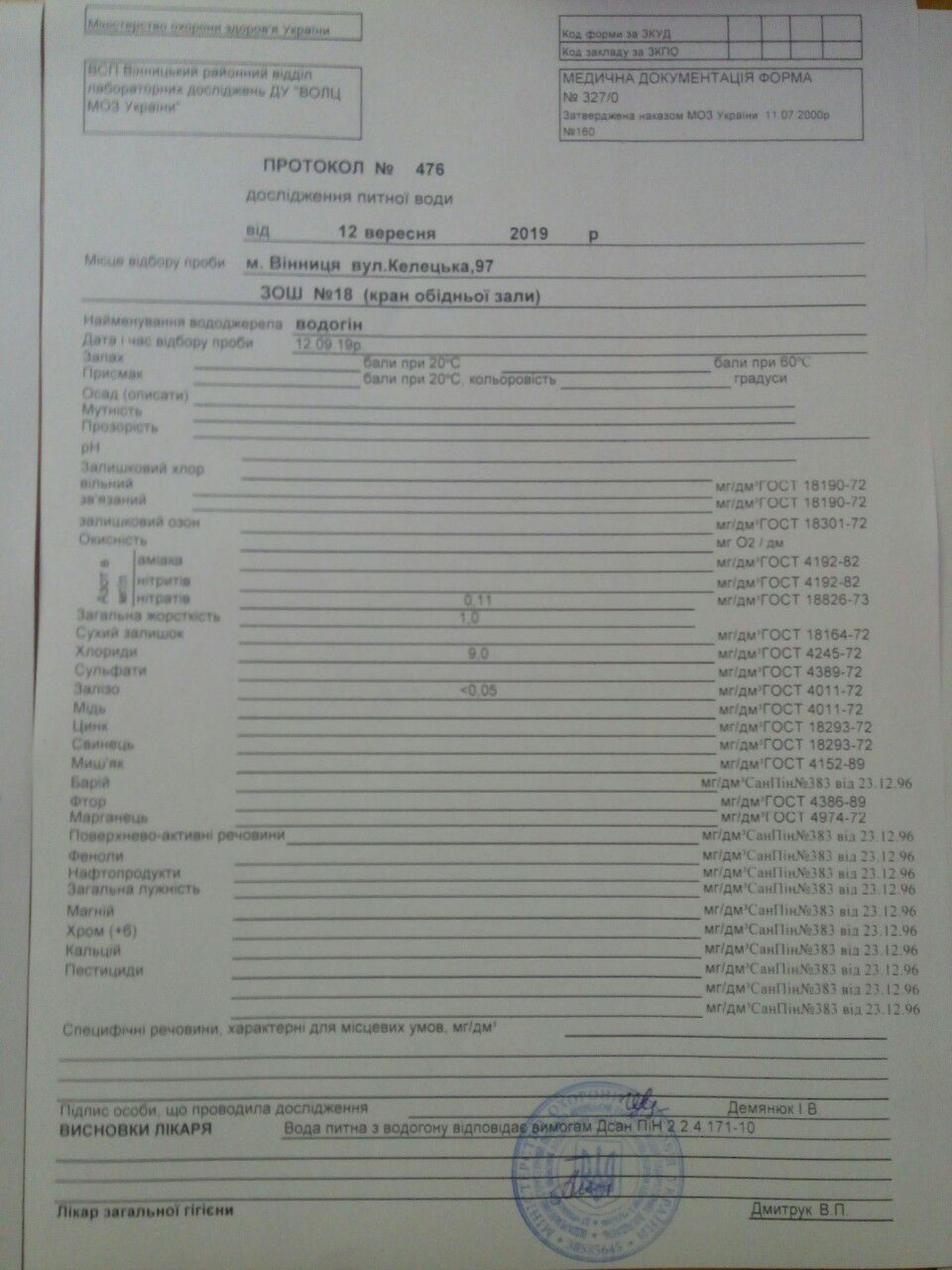 Аналізував Вінницький районний відділ лабораторних досліджень. Воду брали у двох школах. До речі, набирала воду фахівець лабораторії.