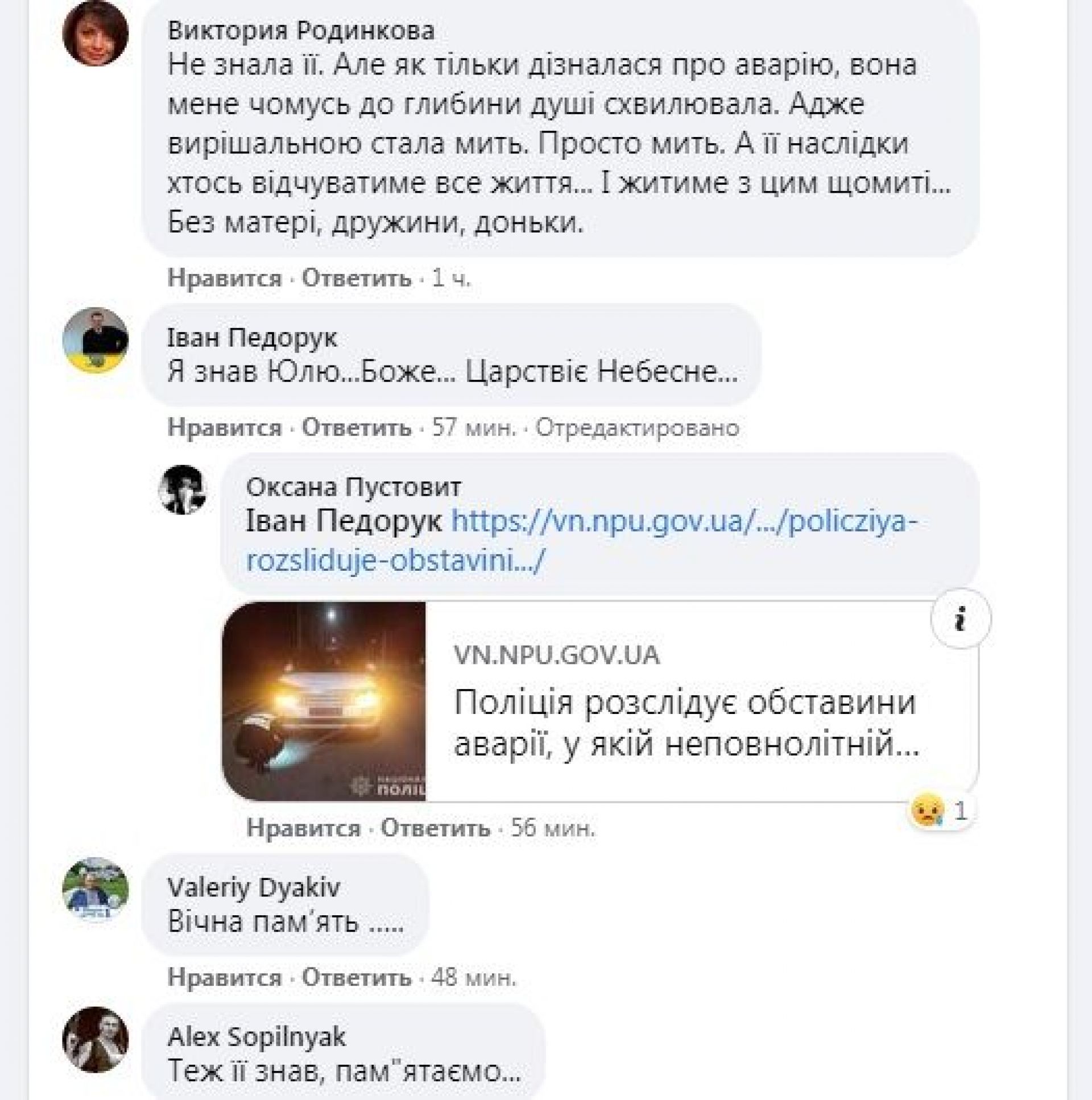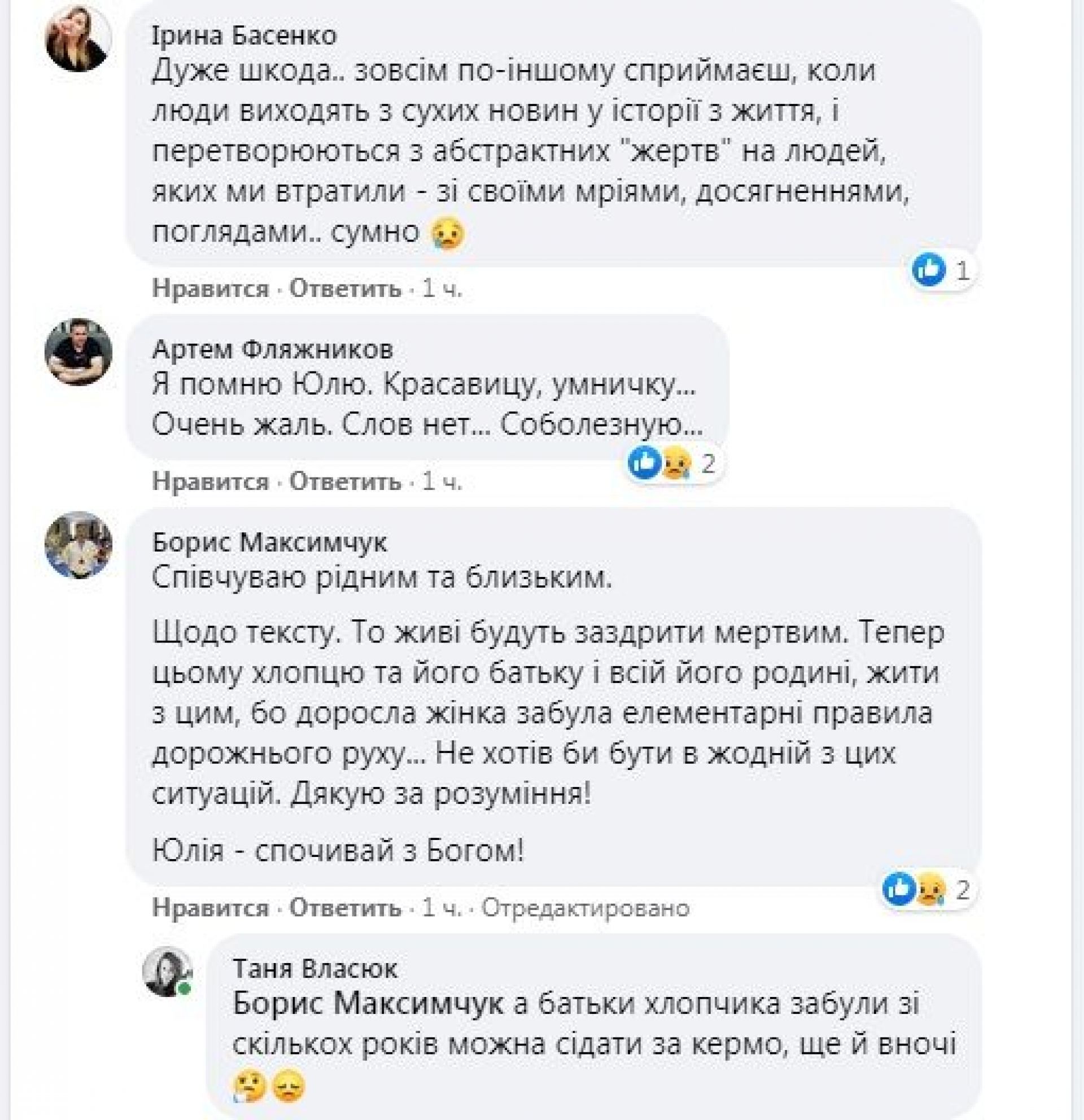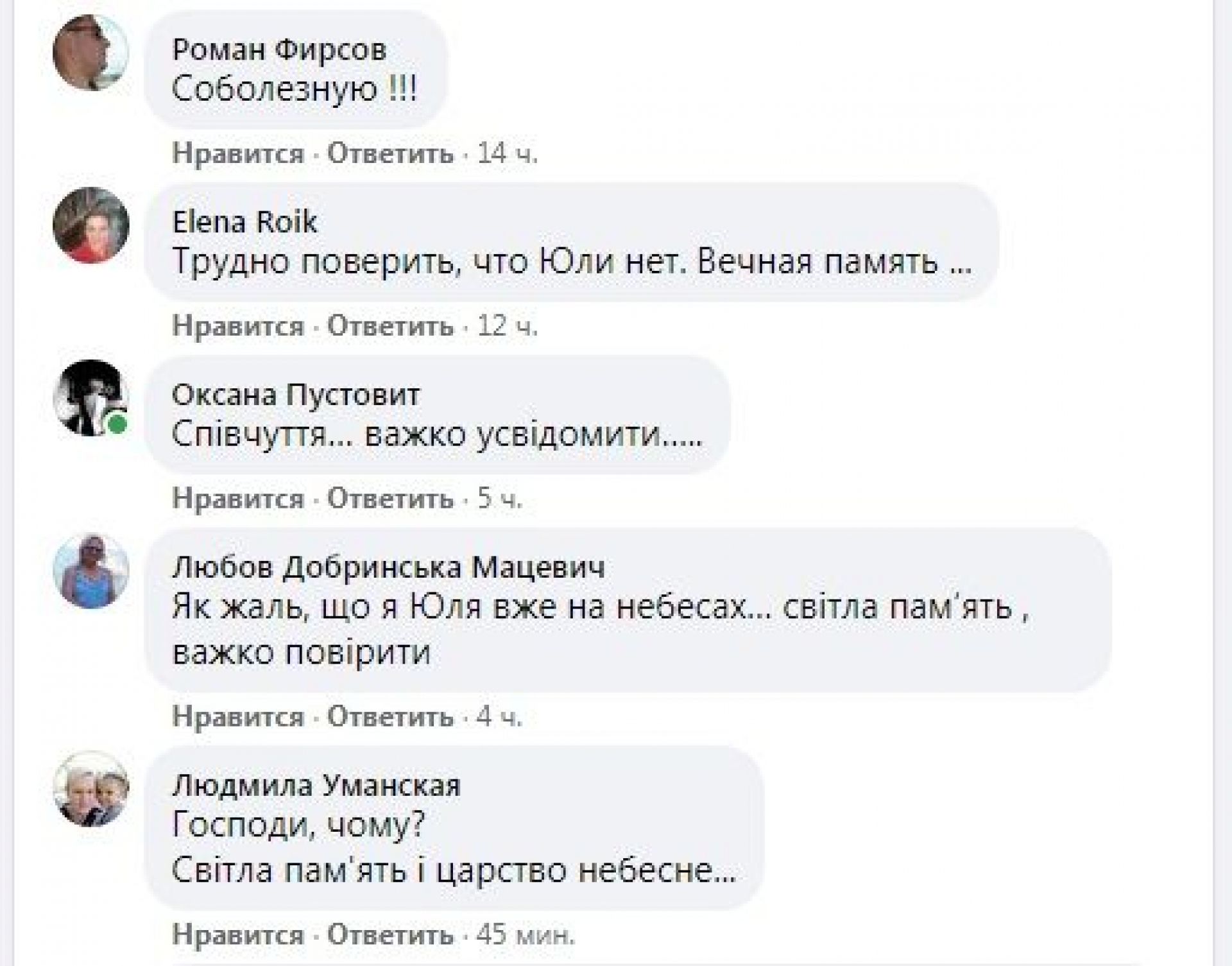 Ось ще один з численних коментарів під публікаціями друзів: «Юля!!! Ну куда ты спешила??? Ну почему??? Спи спокойно, Юлечка».