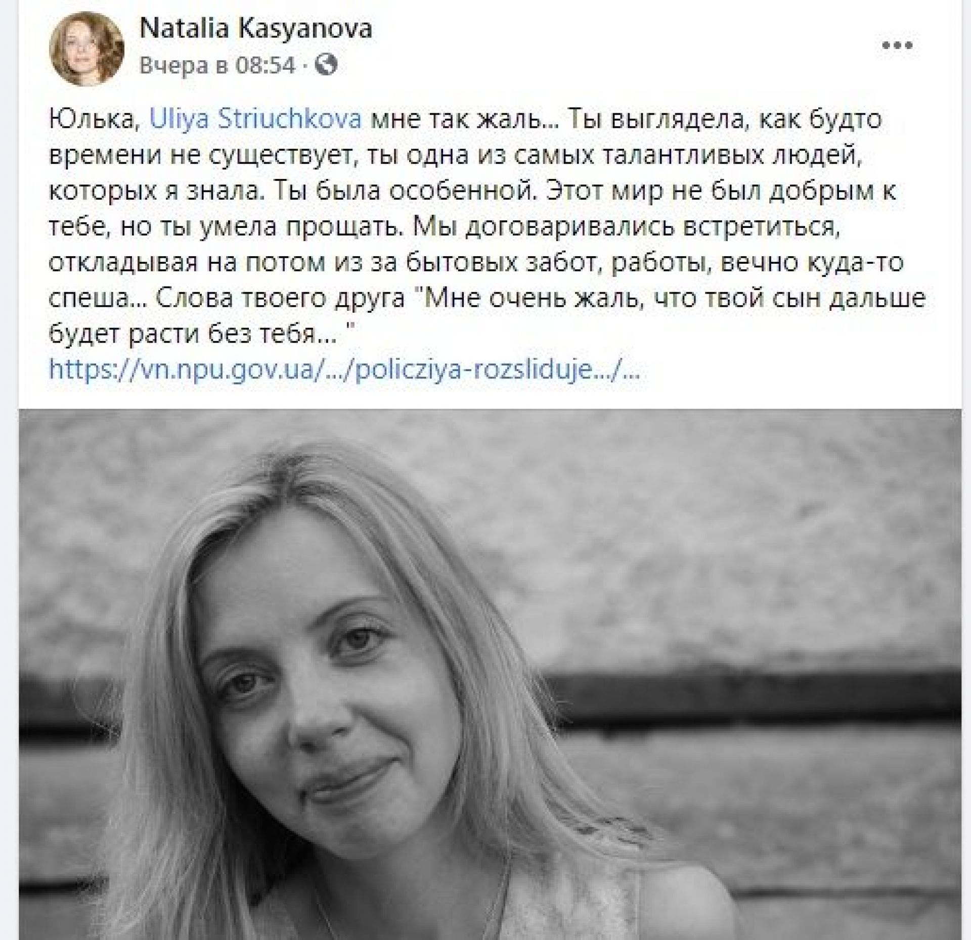 «Юлька, мені так шкода… Ти виглядала так, наче часу не існує, ти одна з найталановитіших людей, котрих я знала. Ти була особливою. Цей світ не був добрий до тебе, але ти вміла пробачати. Ми домовлялися зустрітися, відкладаючи на потім через побутові клопоти, роботи, постійно кудись поспішаючи… Слова твого друга: «Мені дуже шкода, що твій син буде рости без тебе».