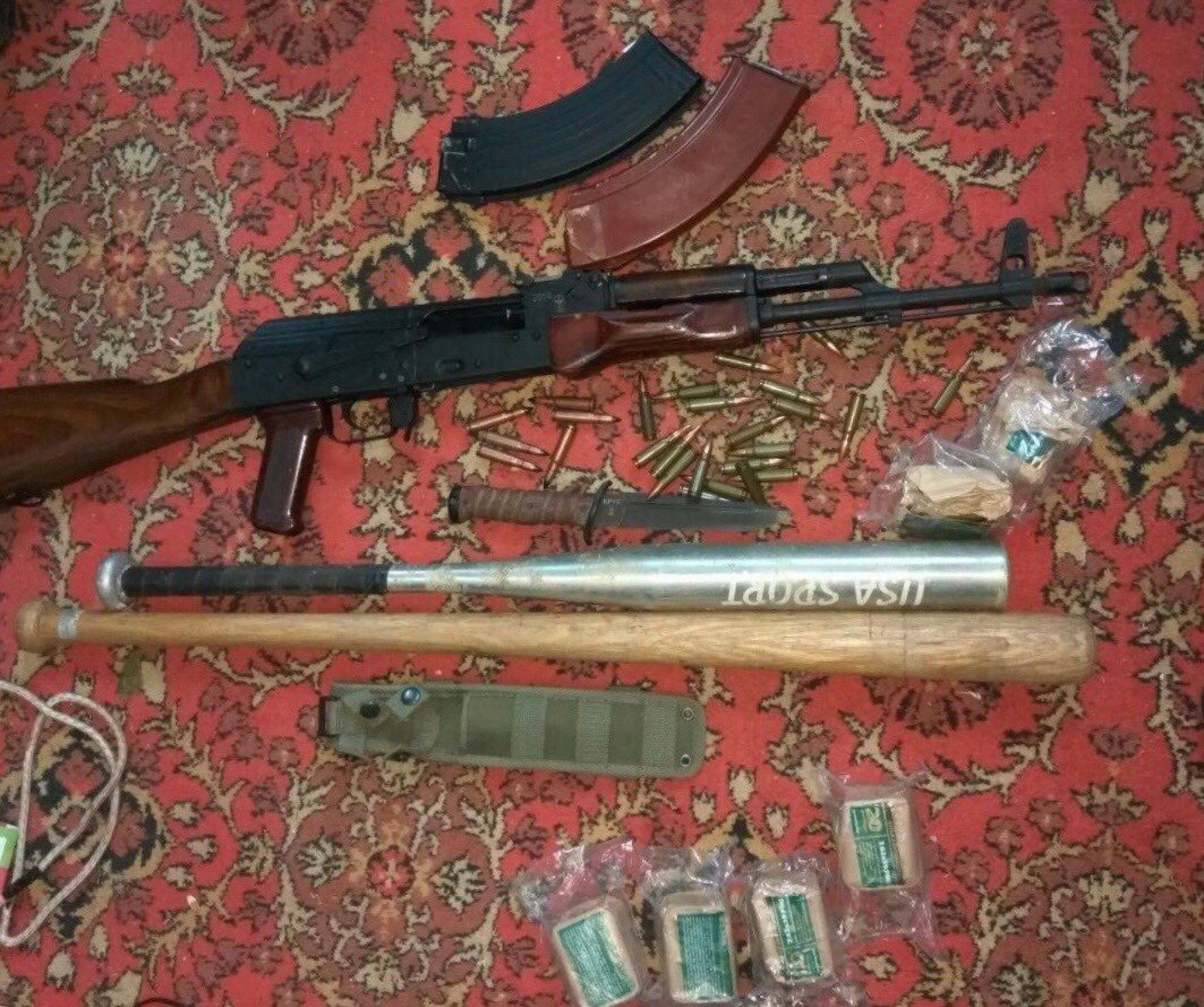 Більше докладної інформації про усіх фігурантів цього кримінального провадження не дають. Але розповсюдили кілька знімків з обушків, на яких показали гроші у різній валюті, автомат, битки та ще деякі із вилучених речей.