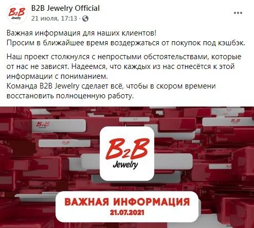 Це було до пандемії, а на час карантину засновник компанії заявив, що через закриття магазинів ставить проект на паузу й припиняє виплати. З послабленням карантинних обмежень з'явилася його нова заява: виплати за вкладами поступово відновлюють. Через два роки діяльності B2B Jewelry, нагадаємо, була перша інформація від СБУ про обшуки та арешти майна.