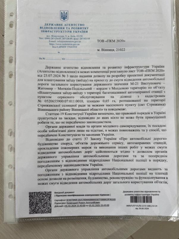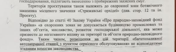 Крім того, до листа було прикріплено відповідь Міндовкілля України від 06.10.2021 № 25/5-21/2180-21 щодо заборони будівництва на цій території. А саме згадується, що власник мав на меті звести АЗС.