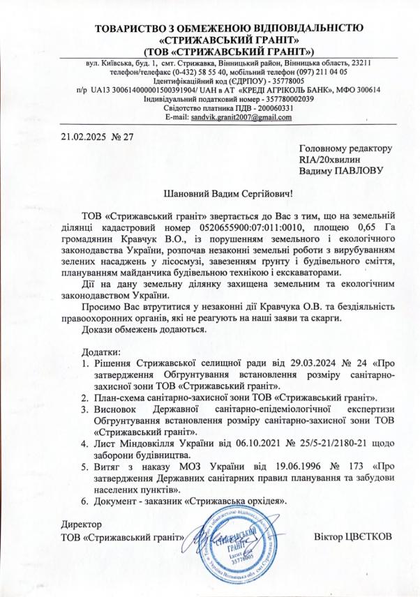 Окремо зазначимо, що відреагували також на звернення Товариства «Стрижавський граніт» щодо бездіяння правоохоронних органів. Так, головний редактор RIA/«20 хвилин» надіслав повідомлення про кримінальне правопорушення та бездіяльність поліції до таких інстанцій: