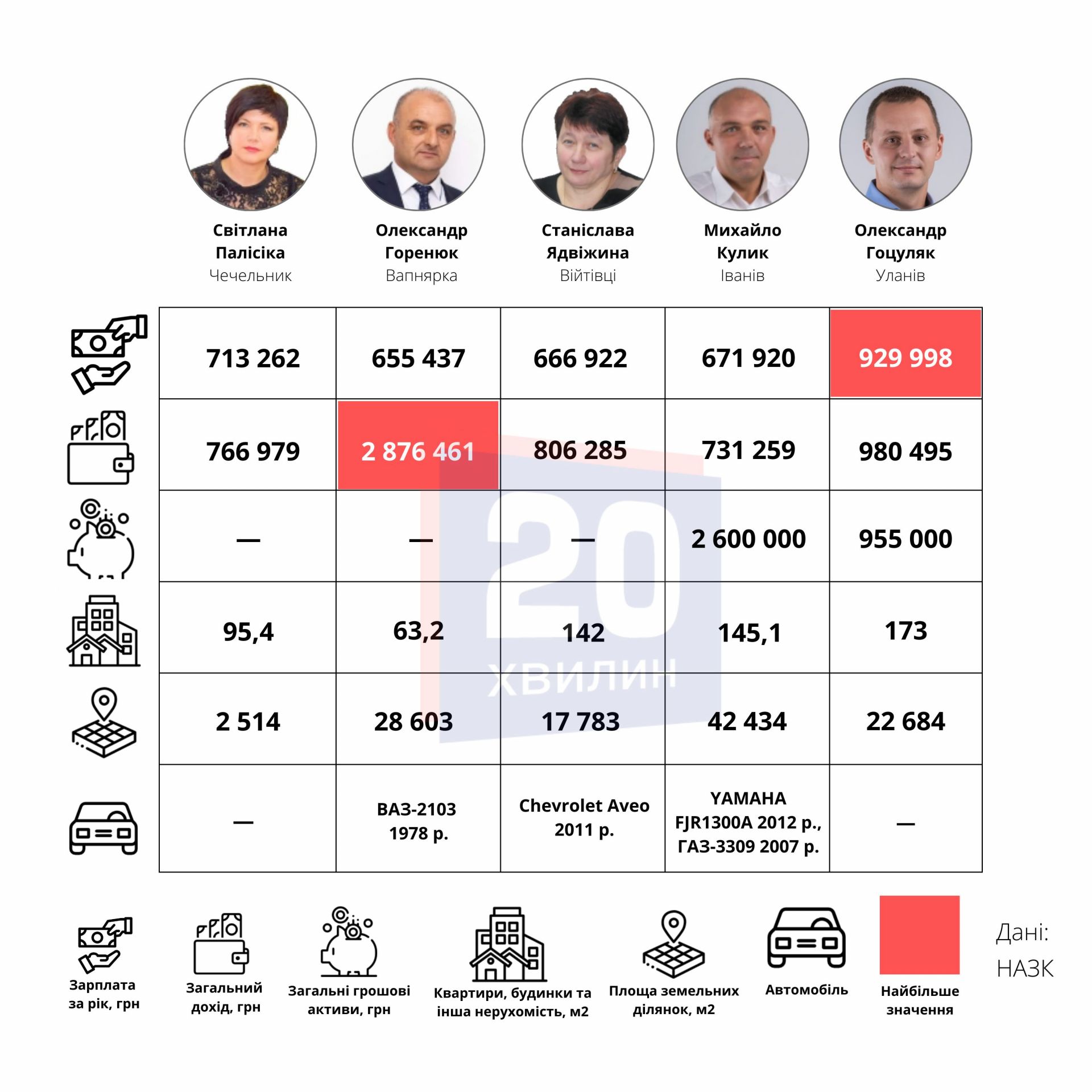 Лідером зі значним відривом є сільський голова Уланова Олександр Гоцуляк. У своїй декларації він вказав, що отримав 929 тисяч гривень зарплати (це до оподаткування - авт.) за увесь 2022 рік.