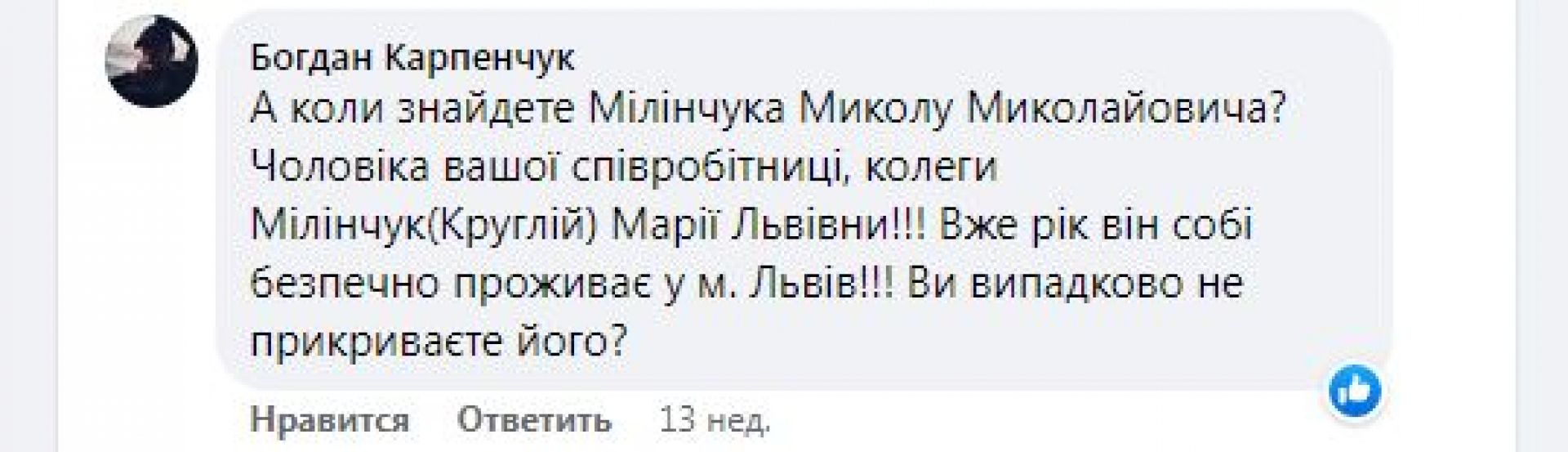 Під поліцейською інформацію про викриття іншого розшукуваного Богдан написав: «А коли знайдете Мілінчука Миколу Миколайовича? Чоловіка вашої співробітниці, колеги Мілінчук(Круглій) Марії Львівни!!! Вже рік він собі безпечно проживає у м. Львів!!! Ви випадково не прикриваєте його?». Відповіді на цей коментар немає.
