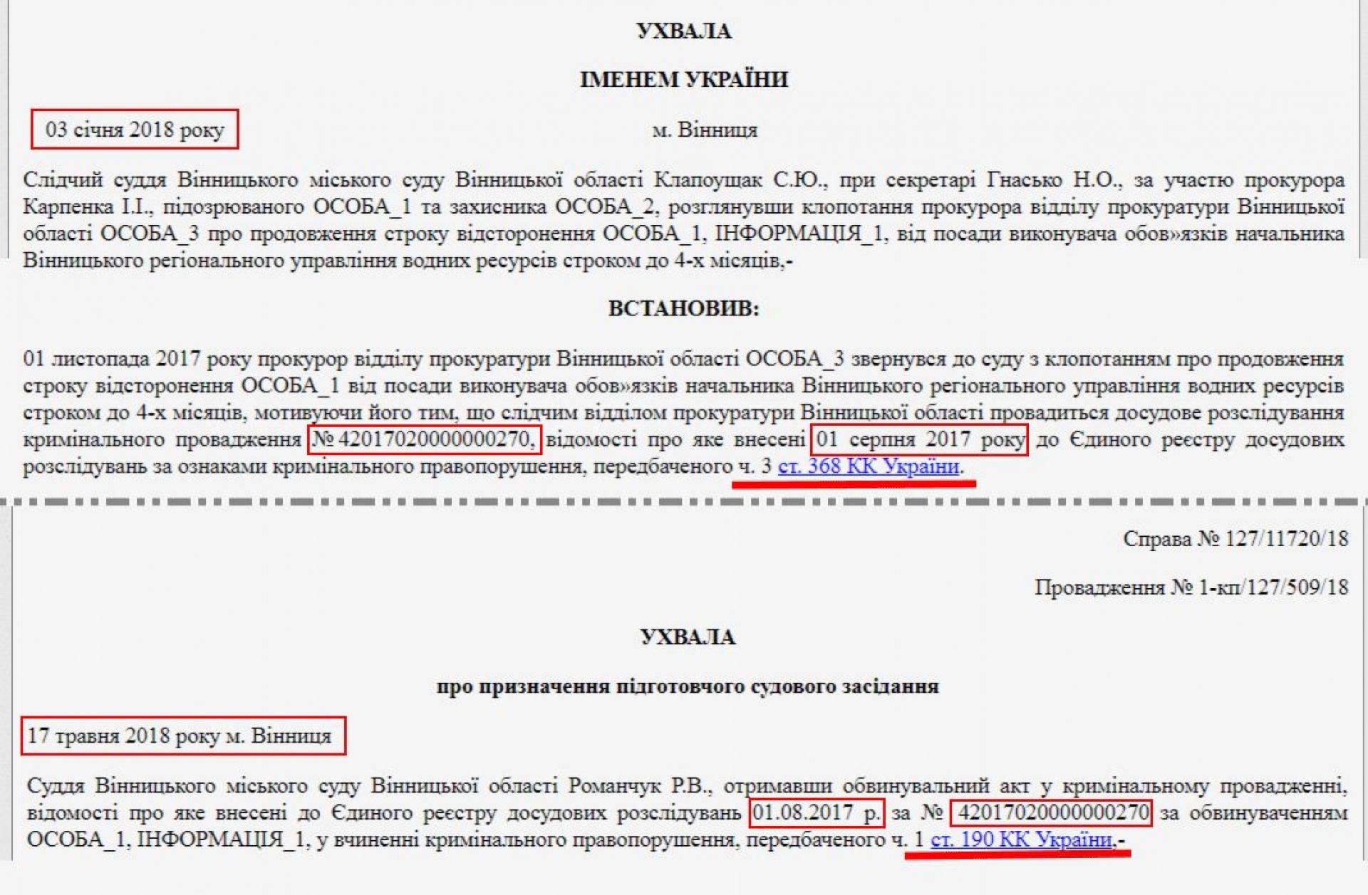 17 травня суддя Вінницького міського суду Руслана Романчук призначила підготовче судове засідання. Читаємо в ухвалі, що до суду надійшов обвинувальний акт щодо Криська… Але злочин уже кваліфікують як шахрайство — за частиною 1 статті 190 ККУ.