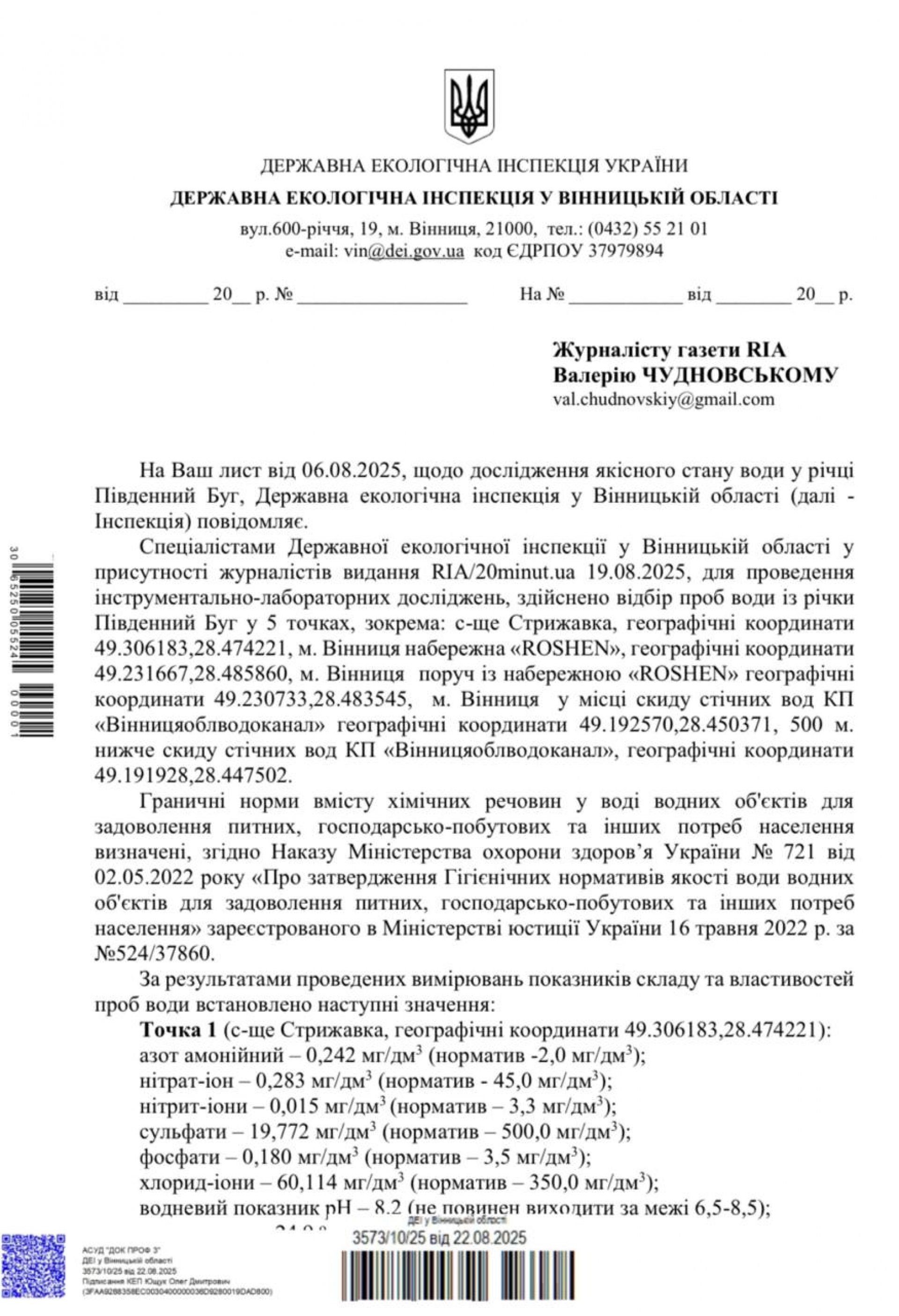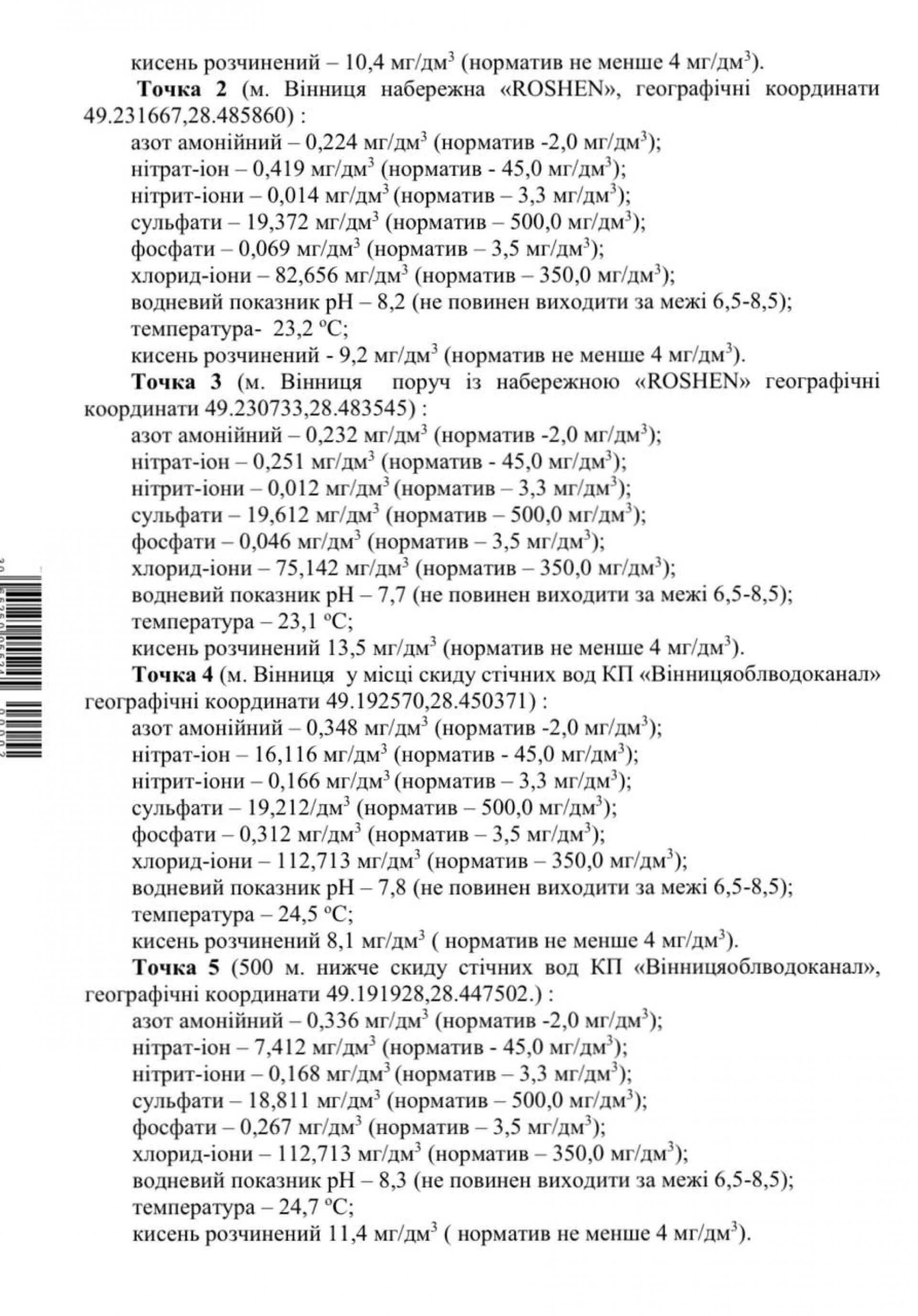 У відповіді на наш запит, екологічна інспекція розповіла, що у період із 2020 по 2025 рік здійснили 42 відбори проб води. За їхніми результатами виявили перевищення азоту амонійного (продукти гниття, фактично концентровані «каналізаційні» стоки) у місцях скиду КП «Вінницяоблводоканал» та нижче за течією.
