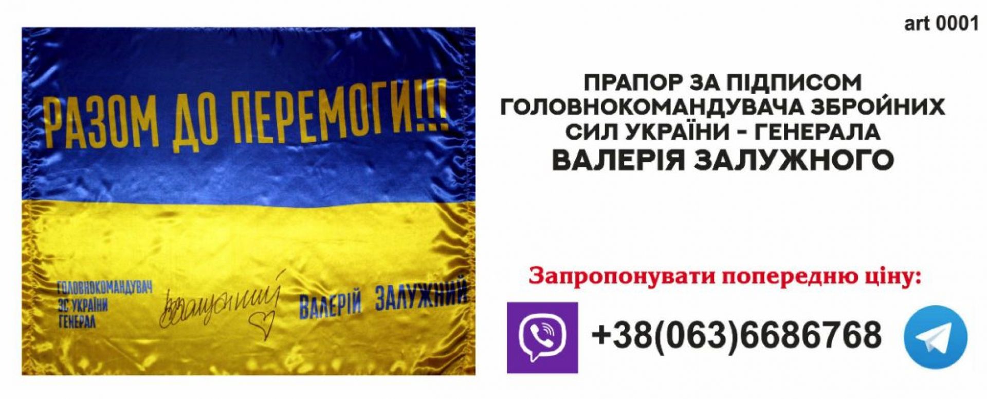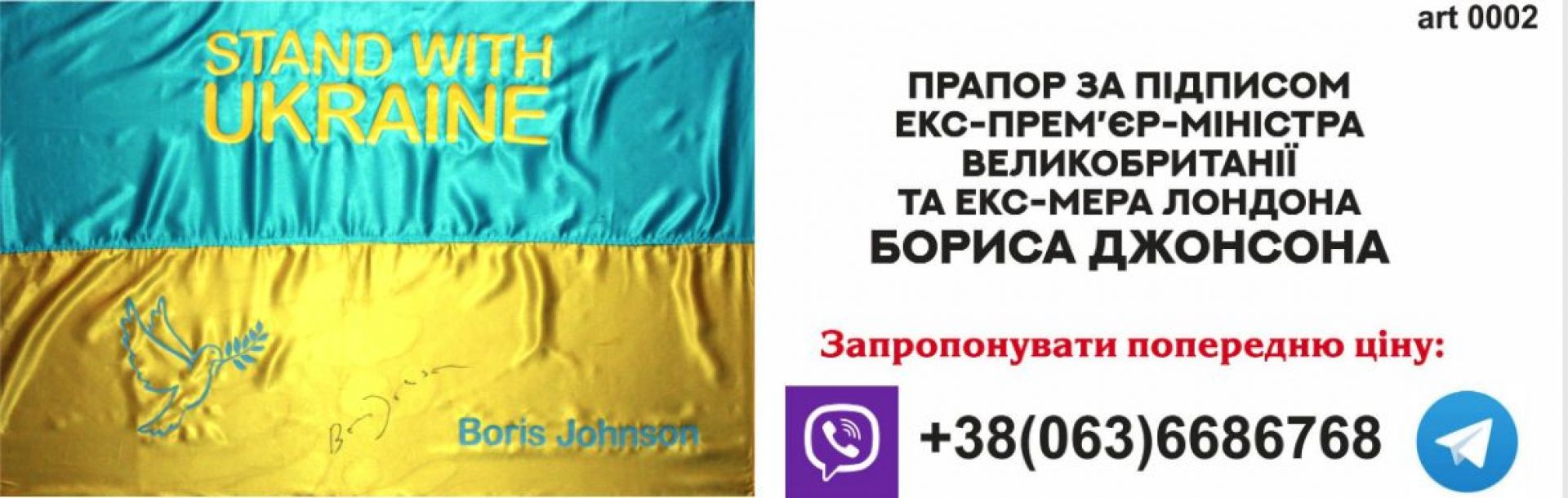 Серед лотів аукціону: прапори із підписами Президента України Володимира Зеленського, головнокомандувача ЗСУ генерала Валерія Залужного та екс-прем’єр-міністра Великобританії Бориса Джонсона.
