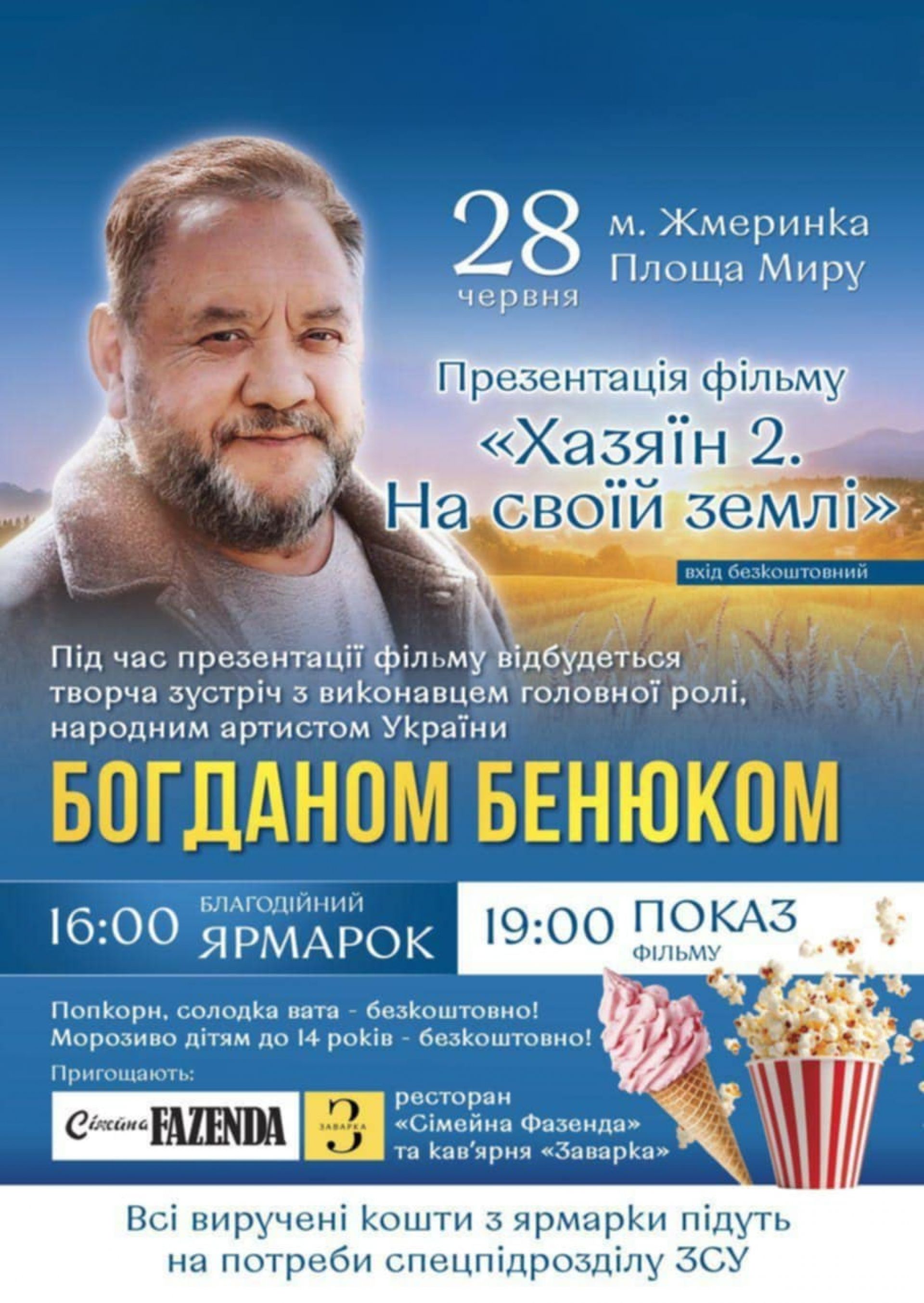 У Жмеринці відбудеться особливий благодійний захід. Народний артист України Богдан Бенюк презентує фільм «Хазяїн 2. На своїй землі», а всі зібрані кошти підуть на підтримку захисників.