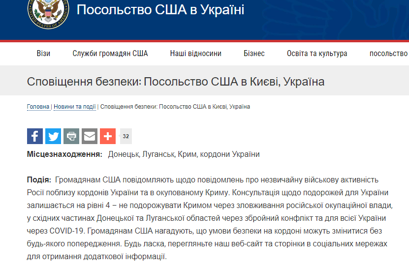 - Посольство США попереджає про небезпеку своїх громадян в Україні.