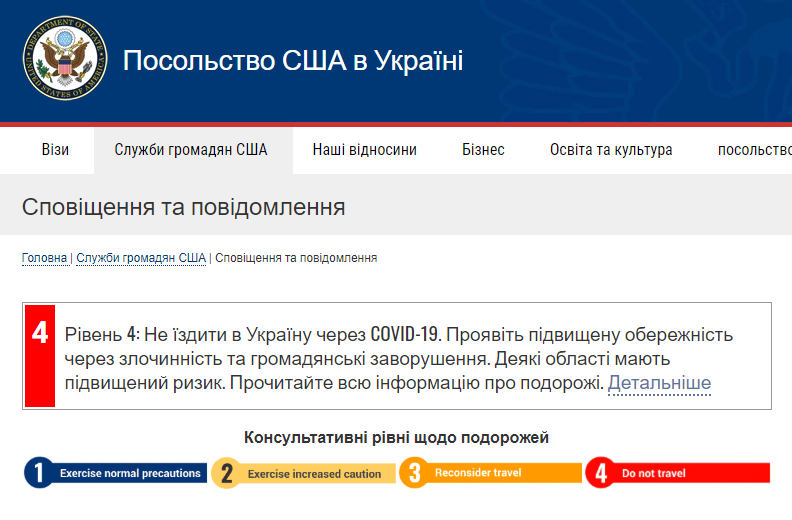 «Не їздити в Україну через COVID-19. Проявіть підвищену обережність через злочинність та громадянські заворушення. Деякі області мають підвищений ризик».