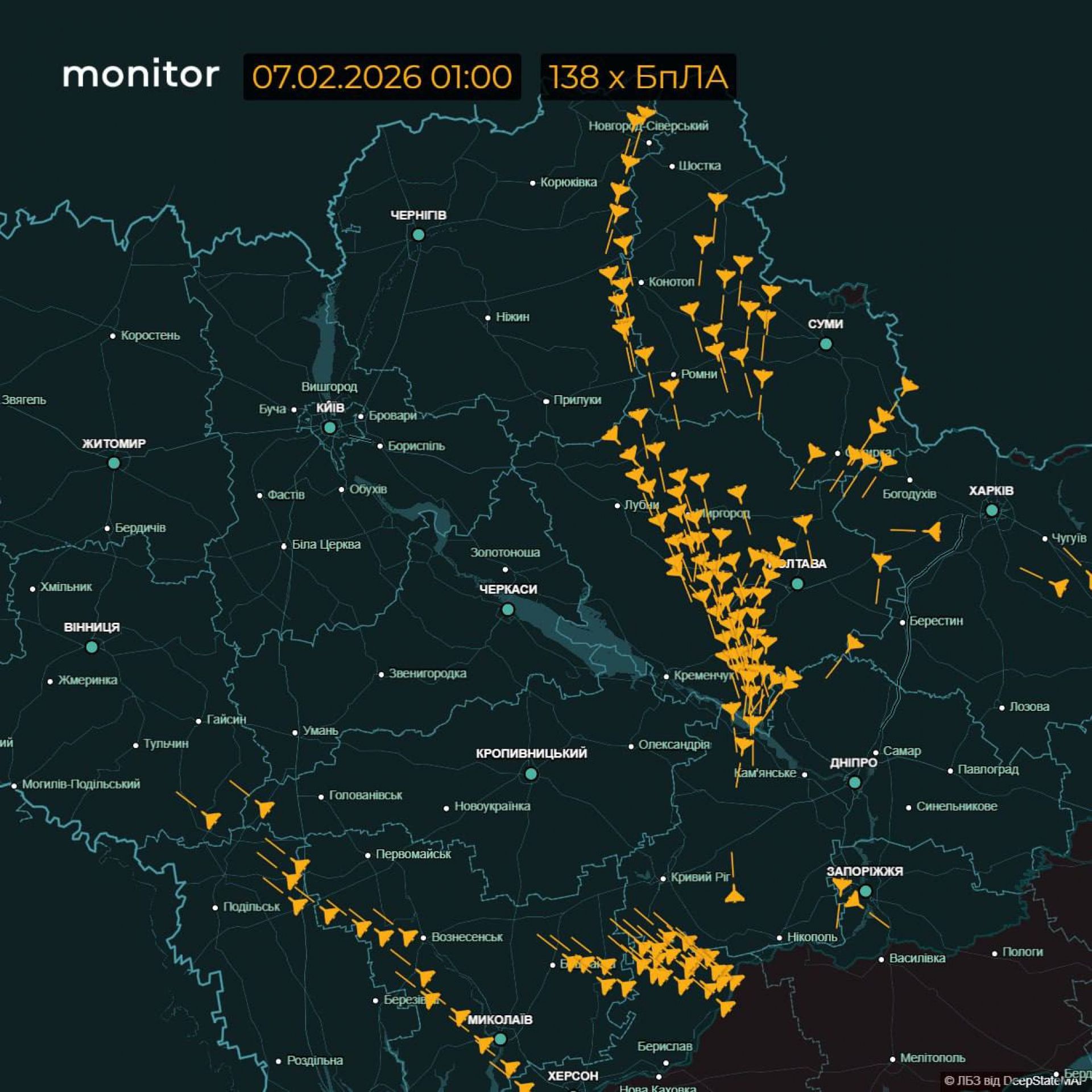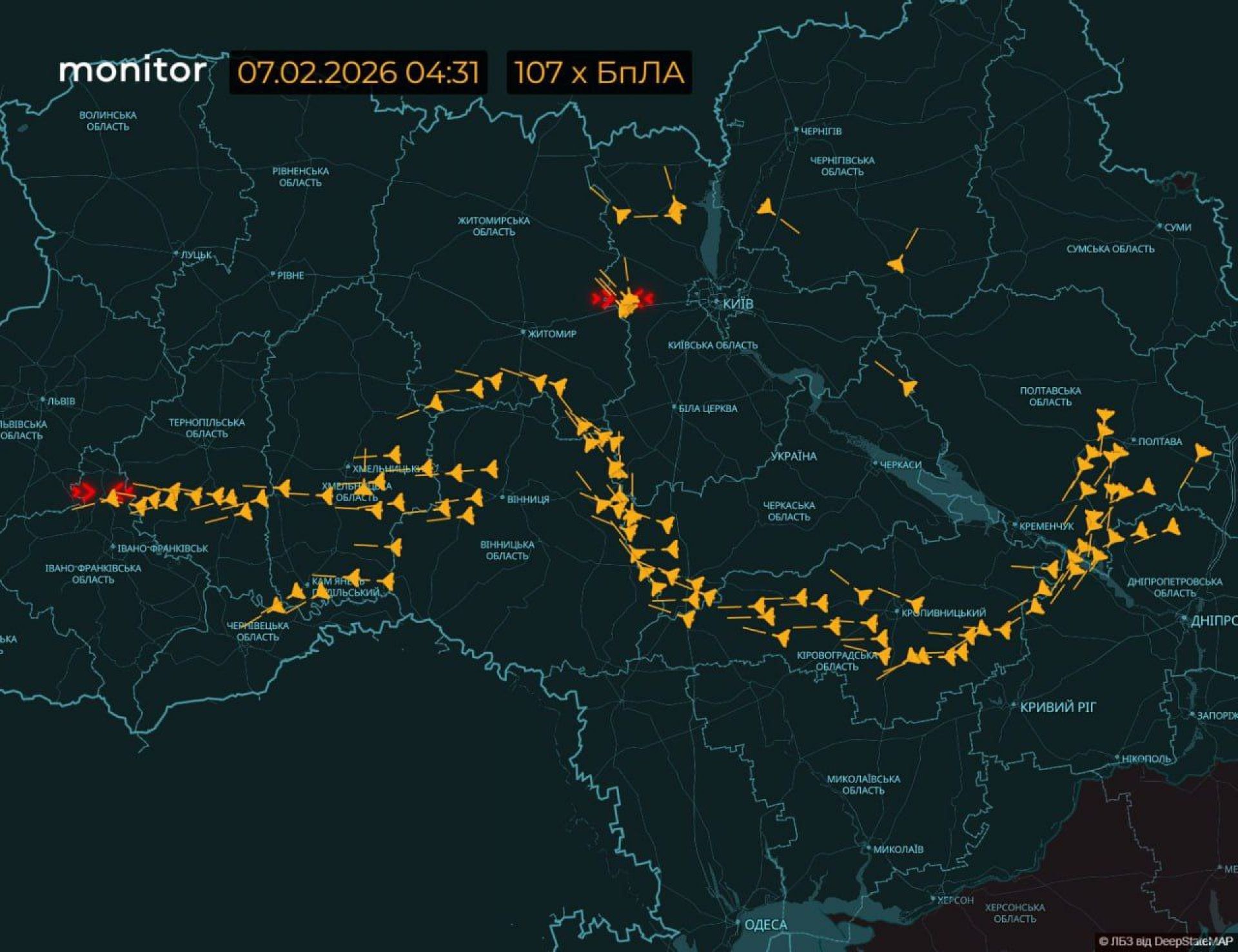 У ніч на 7 лютого Росія здійснила масштабний повітряний напад на територію України. Вінниччина стала одним із головних напрямків удару. Тривога в окремих районах почалася ще о 0.41 ночі й тривала до 9.48 ранку. Протягом цього часу в небі над областю фіксували десятки ударних дронів та ракети.