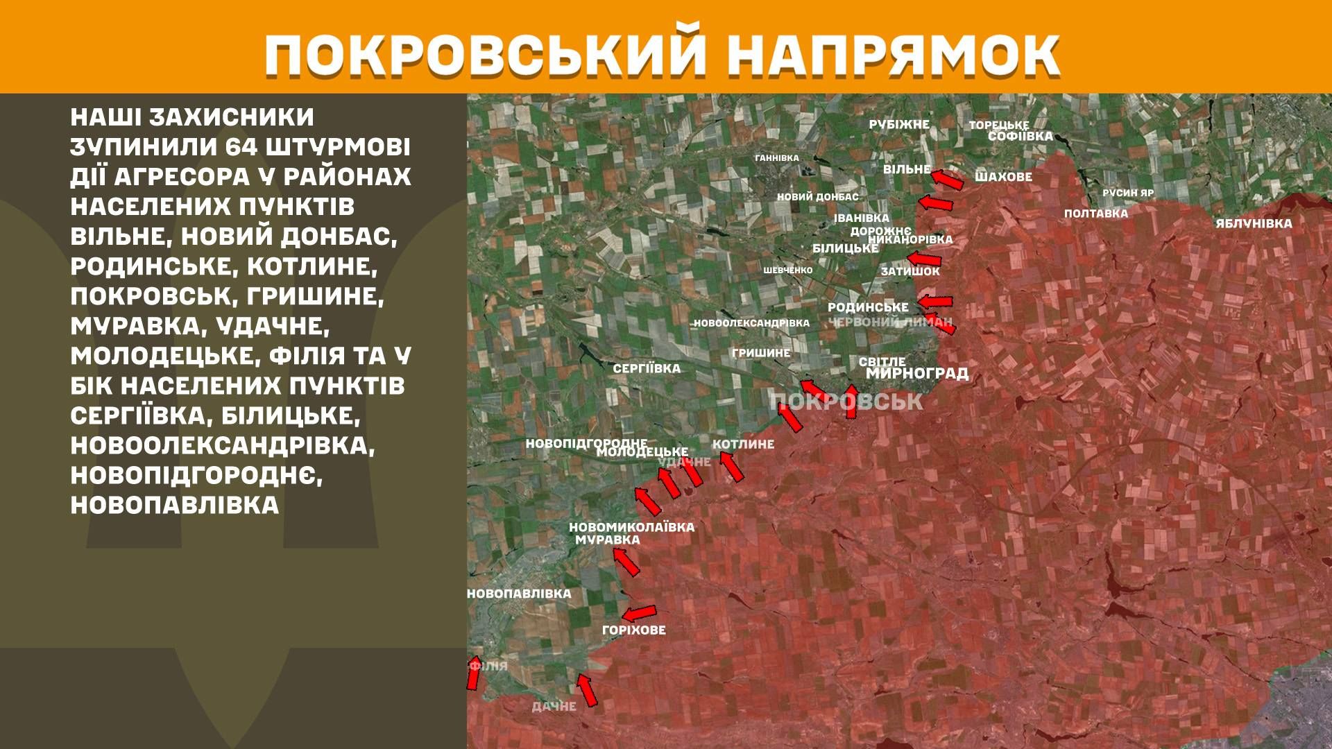 Найбільша кількість атак припадає на Покровський напрямок. Тут сили оборони зупинили 64 штурмові дії агресора поблизу Покровська, Родинського, Удачного та інших населених пунктів. Також висока активність ворога спостерігається на Костянтинівському напрямку, де воїни відбили 28 атак, та на Лиманському напрямку, де росіяни 20 разів намагалися вклинитися в нашу оборону.