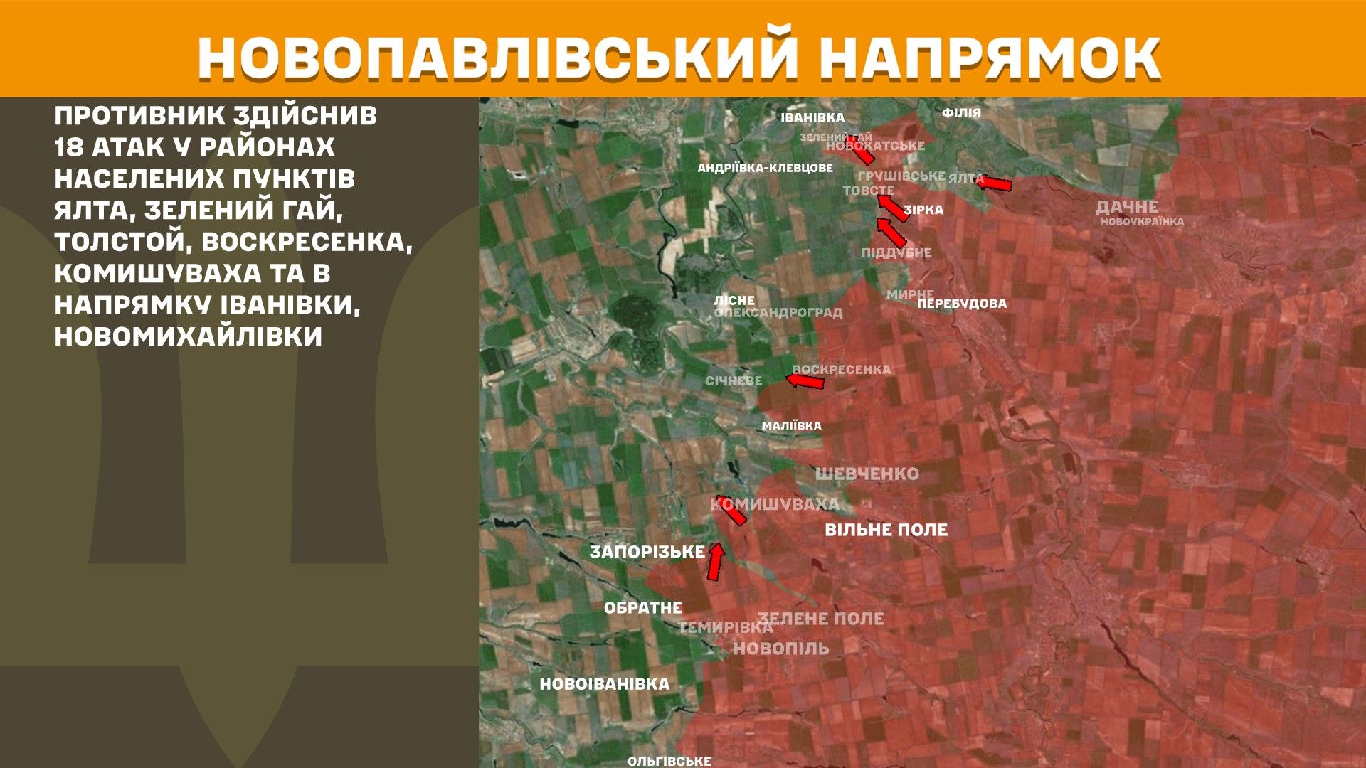 - Новопавлівський напрямок: зафіксовано 18 атак противника.