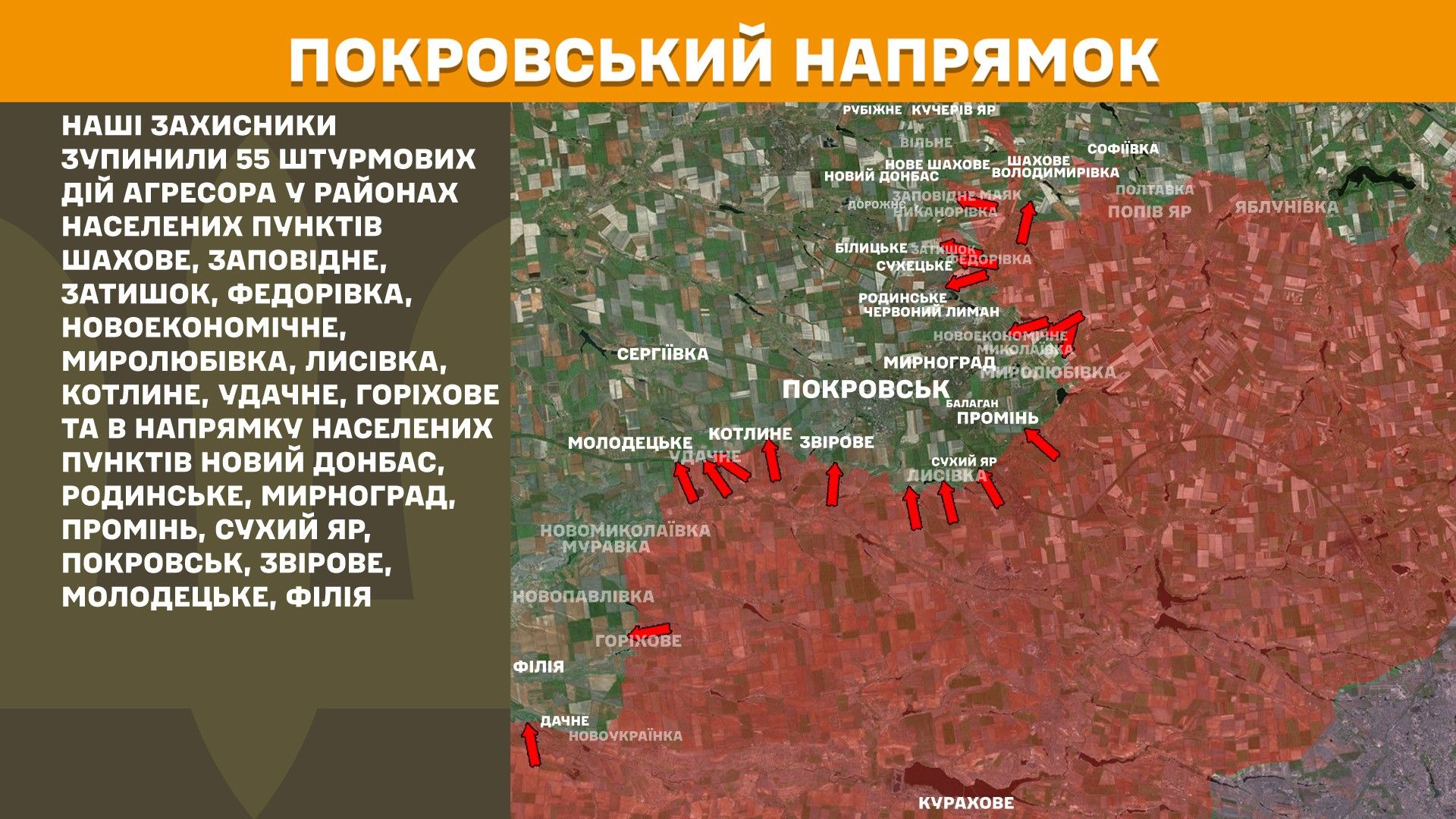 - Покровський напрямок: тут наші захисники відбили 55 штурмових дій агресора.