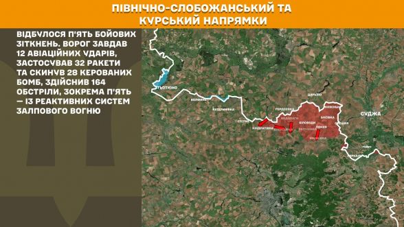 Північно-Слобожанський і Курський | 5 зіткнень | Ворог завдав 12 авіаударів, застосував 32 ракети та скинув 28 КАБів. |