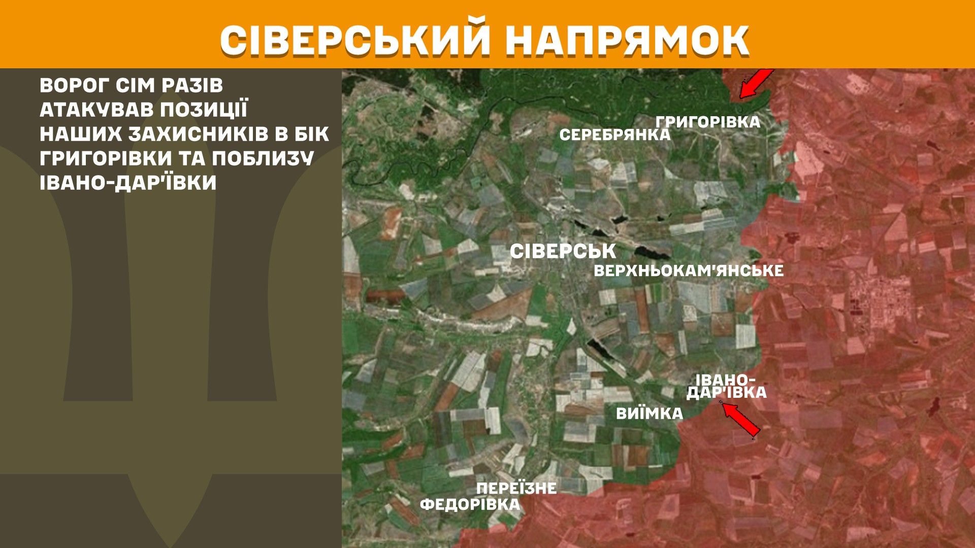 На Сіверському напрямку ворог сім разів атакував позиції наших захисників в бік Григорівки та поблизу Івано-Дар’ївки.
