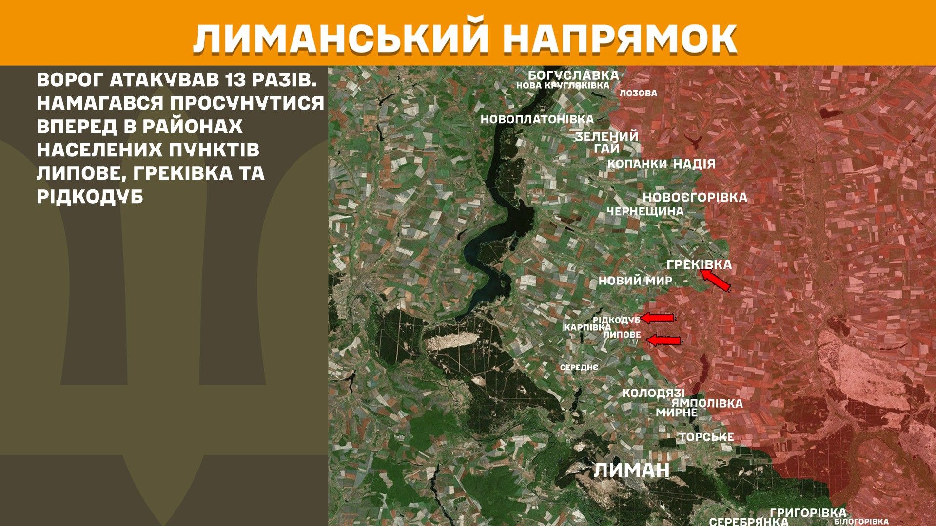 На Лиманському напрямку ворог атакував 13 разів. Намагався просунутися вперед в районах населених пунктів Липове, Греківка та Рідкодуб.
