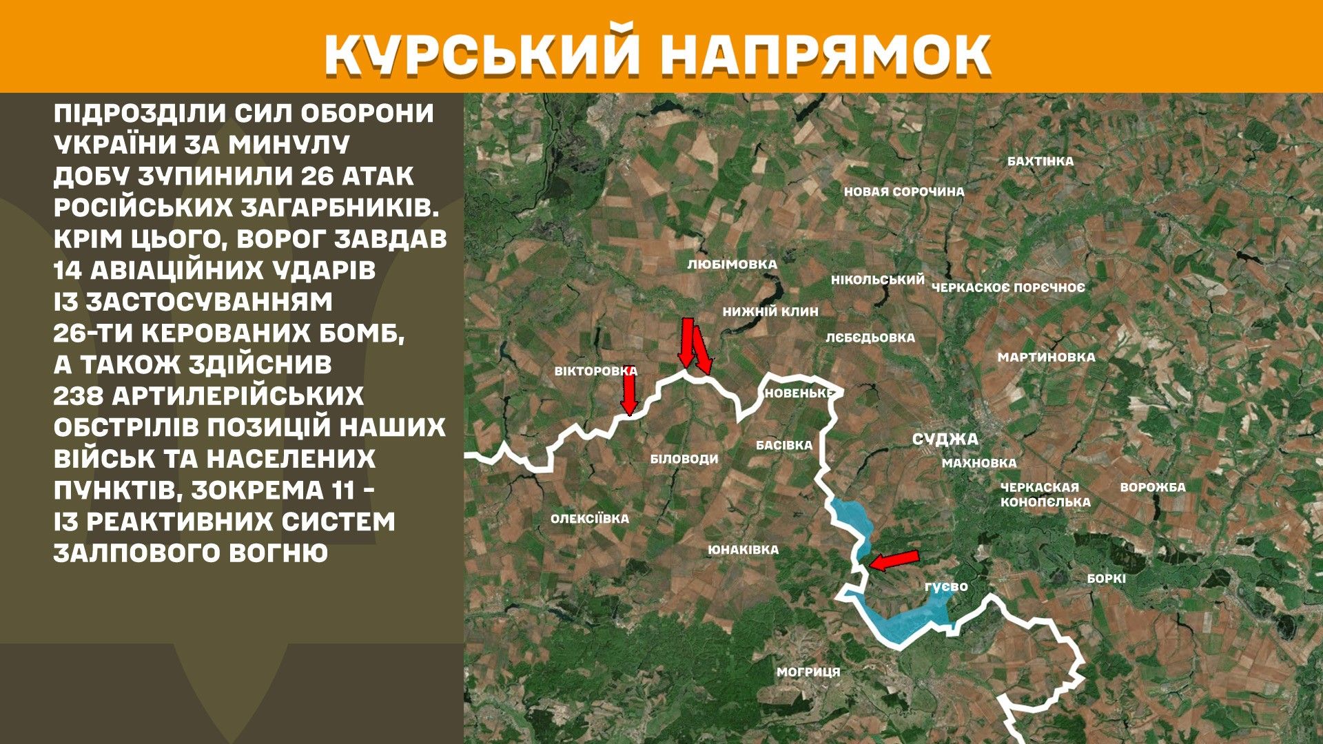 На Курському напрямку підрозділи Сил оборони України за минулу добу зупинили 26 атак російських загарбників. Крім цього, ворог завдав 14 авіаційних ударів із застосуванням 26 керованих бомб, а також здійснив 238 артилерійських обстрілів позицій наших військ та населених пунктів, зокрема 11 - із реактивних систем залпового вогню.