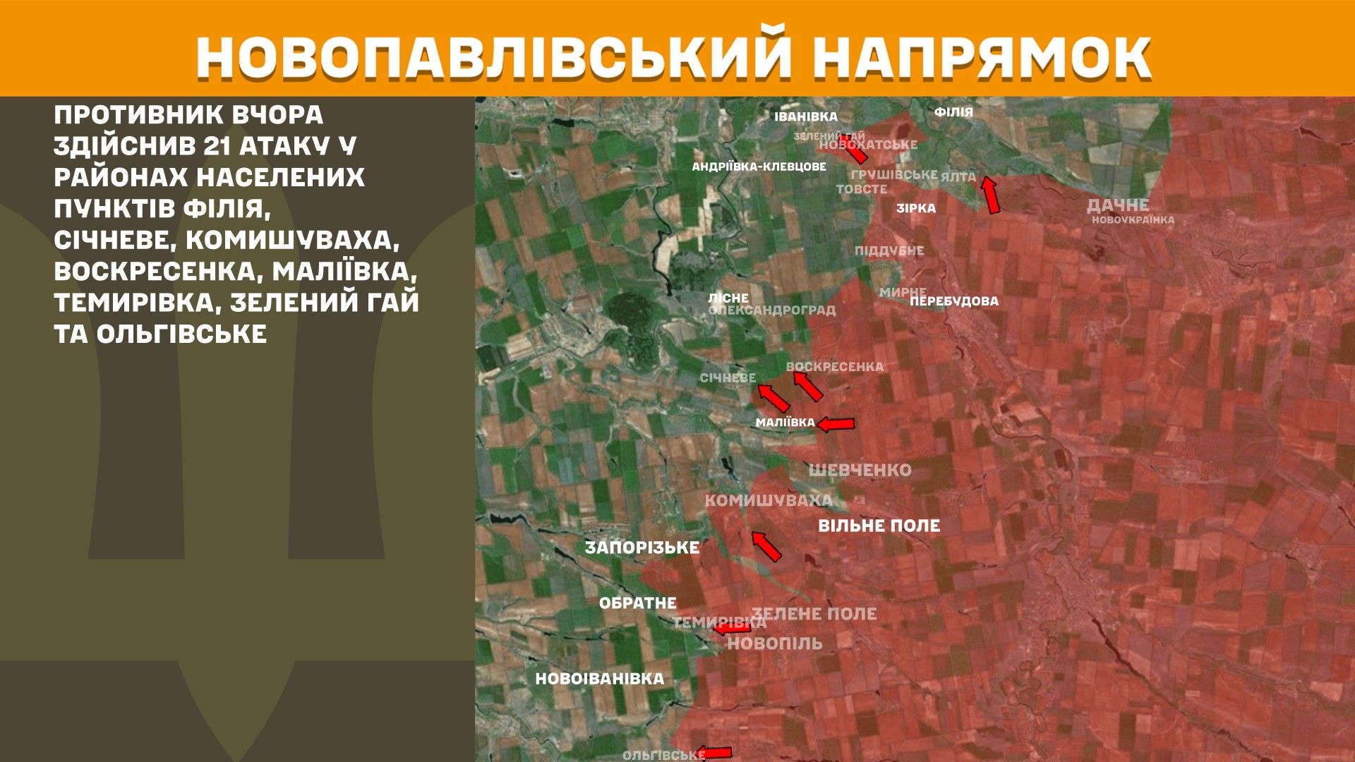 Новопавлівський напрямок: Українські воїни стримали 21 атаку.